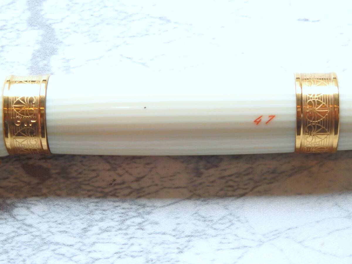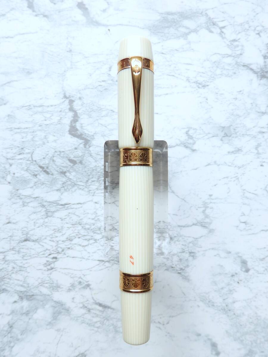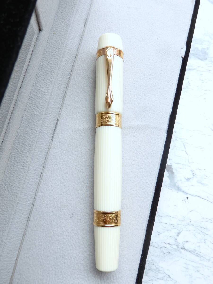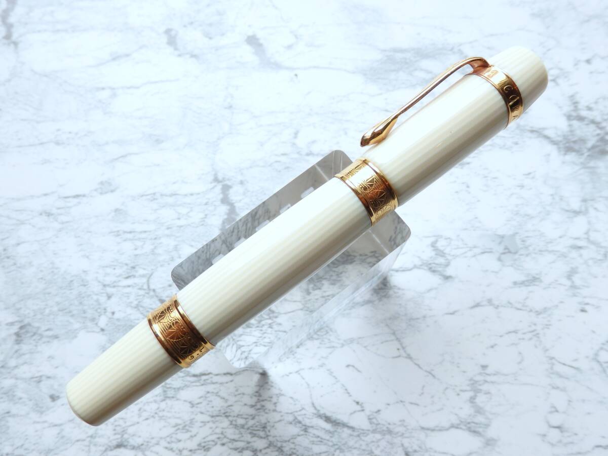 この軸とキャップは、その特徴を余すことなく現わし、象牙に似た非常に美しい逸品です。日本では、もう出てくることはないと思います。