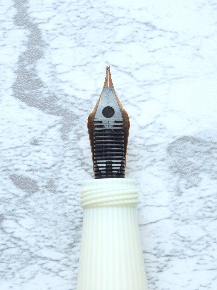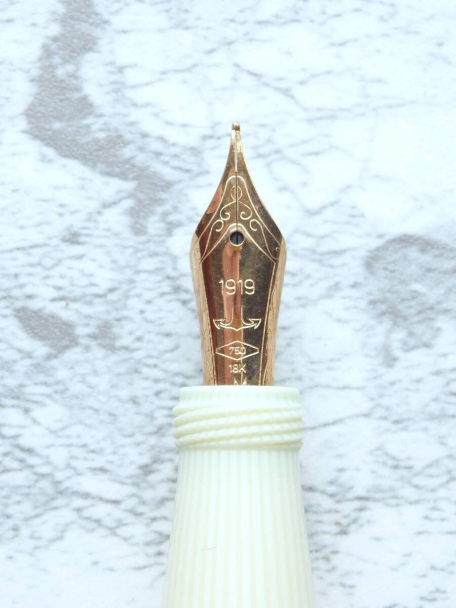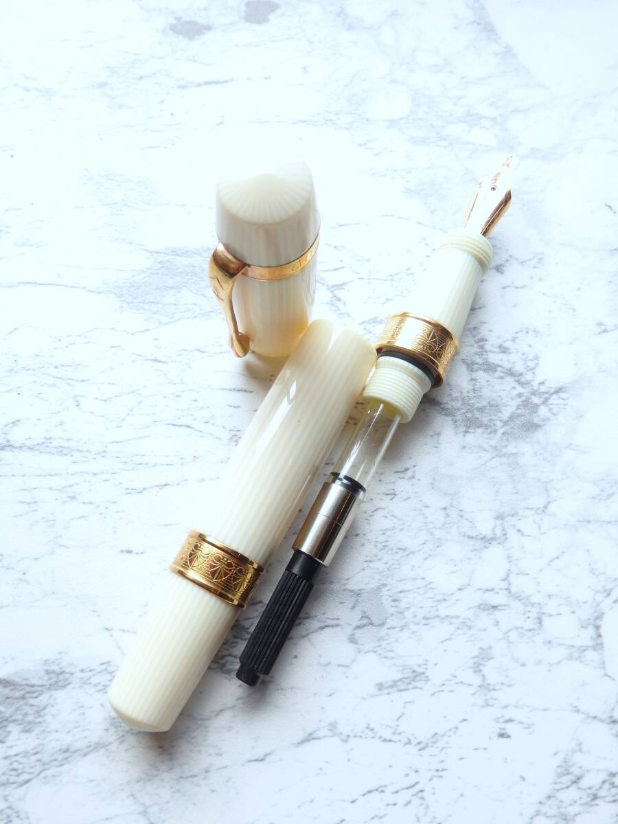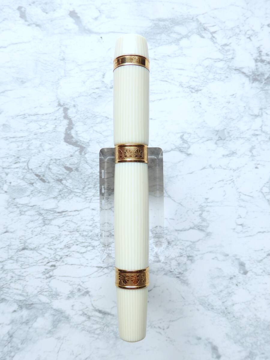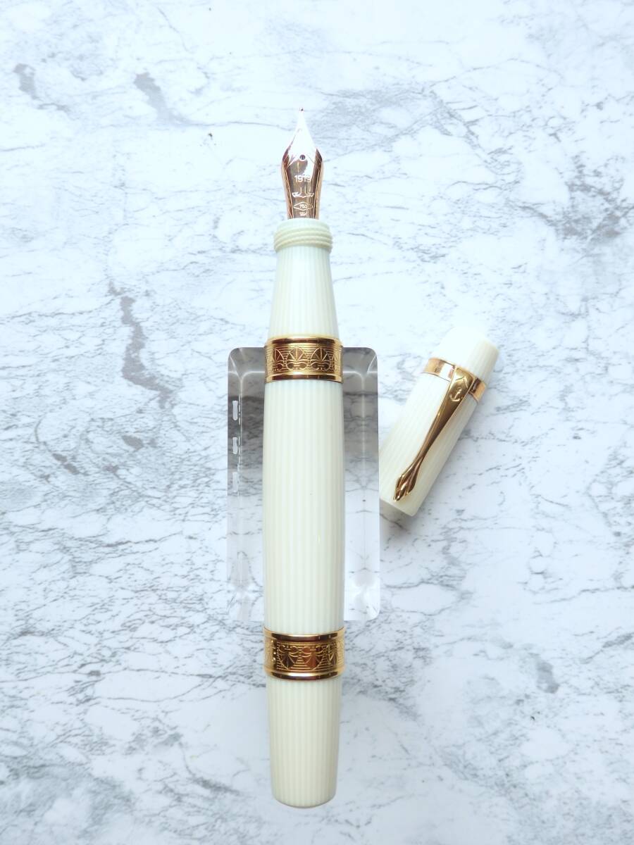 この軸とキャップは、その特徴を余すことなく現わし、象牙に似た非常に美しい逸品です。日本では、もう出てくることはないと思います。