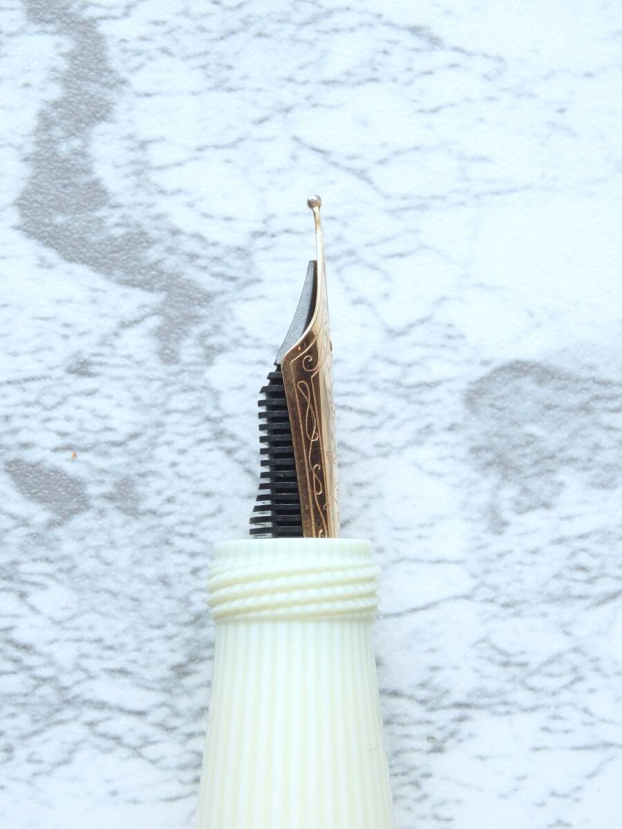 ハイレグニブになっているペン先は、フレックスニブの一種で、筆圧をなくして書けば細字に、筆圧をかけて書けば太字まで書ける優れものです。
