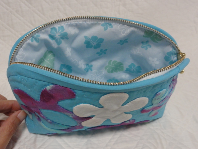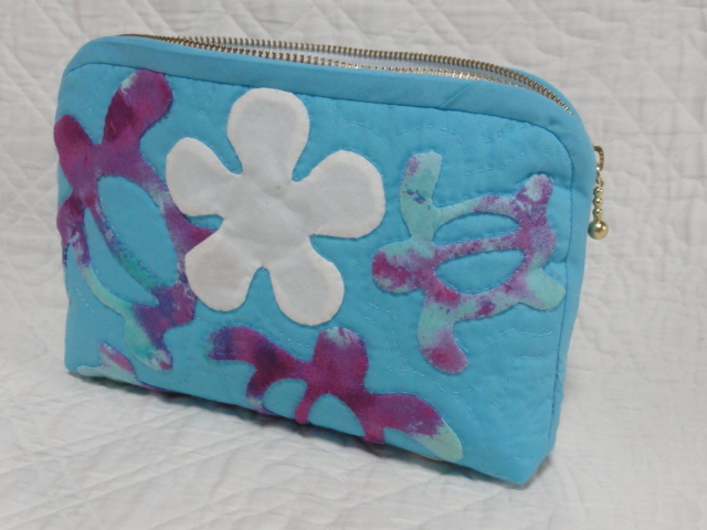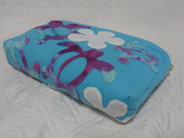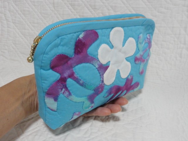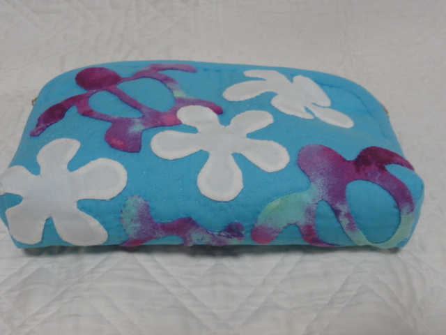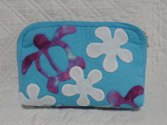 水色の土台布にむら染めのホヌとプルメリアをアップリケしたハワイアンキルトのポーチです。