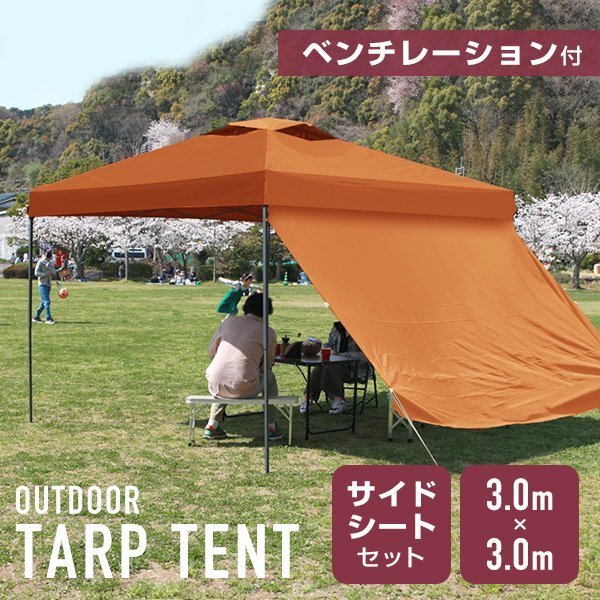 アウトドア、運動会、その他イベントなどでも大活躍は間違いなし!! さらに、上部にはベンチレーションが装備されており、 急な突風などが吹いても倒れにくい設計です。 組立は女性でも簡単!!「パッ」っと開くだけ!! 他にも細部までこだわった機能がたくさん♪ 嬉しいサイドシートセット! 横からの日差しもカット。当店のタープテントにピッタリなサイドシートです。 サイドシートの裏側もしっかりとシルバーコーティングされており、 真夏のジリジリとした厚さでも紫外線をしっかりガードしてくれます。 全9ヶ所に取り付けられたマジックテープで着脱も簡単。 最大4面の取り付けが可能なので目隠しが必要な場合でも使用することが出来ます! 【商品仕様】 カラー:オレンジ 商品サイズ: ●タープテント 使用時(約):幅300×奥行300×高さ171~260cm 収納時(約):幅119×奥行21×高さ21cm ●サイドシート (約)200×300cm 材質:スチール、ポリエステル 重量(約):12kg 【商品内容】 タープテント本体 ロープ ×4 ペグ ×8 サイドシート×1 専用収納ケース ※こちらの商品はタープテント&サイドシートのセット商品です。 |