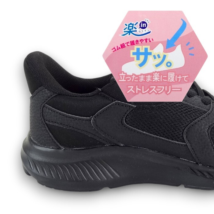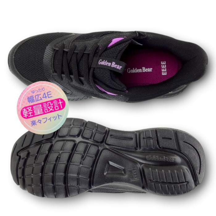 ブランド名:Golden Bear 品番:GB-427 カラー:ブラック、クロ くろ サイズ:22.5cm 靴の幅:4E EEEE 片足重量:約225g(23.5cmで計測した場合) かかと高さ:約3.5cm 素材:合成繊維、合成皮革、合成底 生産国:中国 履き口が広めに作られ、かかとに芯が入っているため手を使わずに履ける「楽インシューズ」、レディースカジュアルシューズです。甲の飾りひもはゴムになっていて伸び縮みするので足にフィットしやすくなっています。 軽くて履きやすい靴なので毎日のお出かけや普段履きに最適です。散歩やタウンウォーキング、旅行など、ちょっと歩くのにちょうどいい!お誕生日や記念の贈り物、プレゼントなどにも喜ばれると思いますよ! | ||