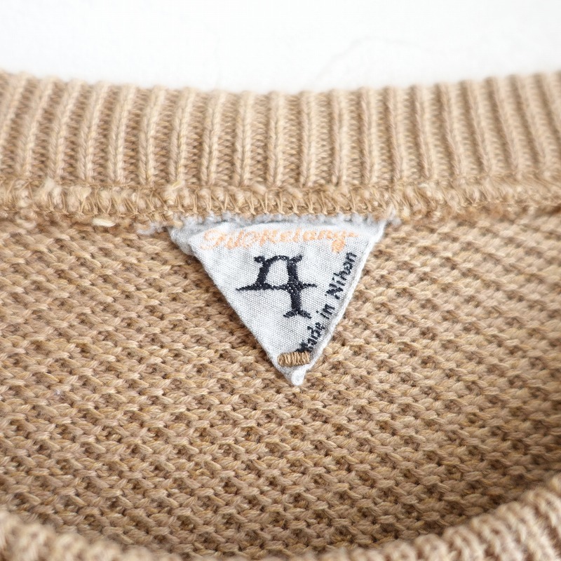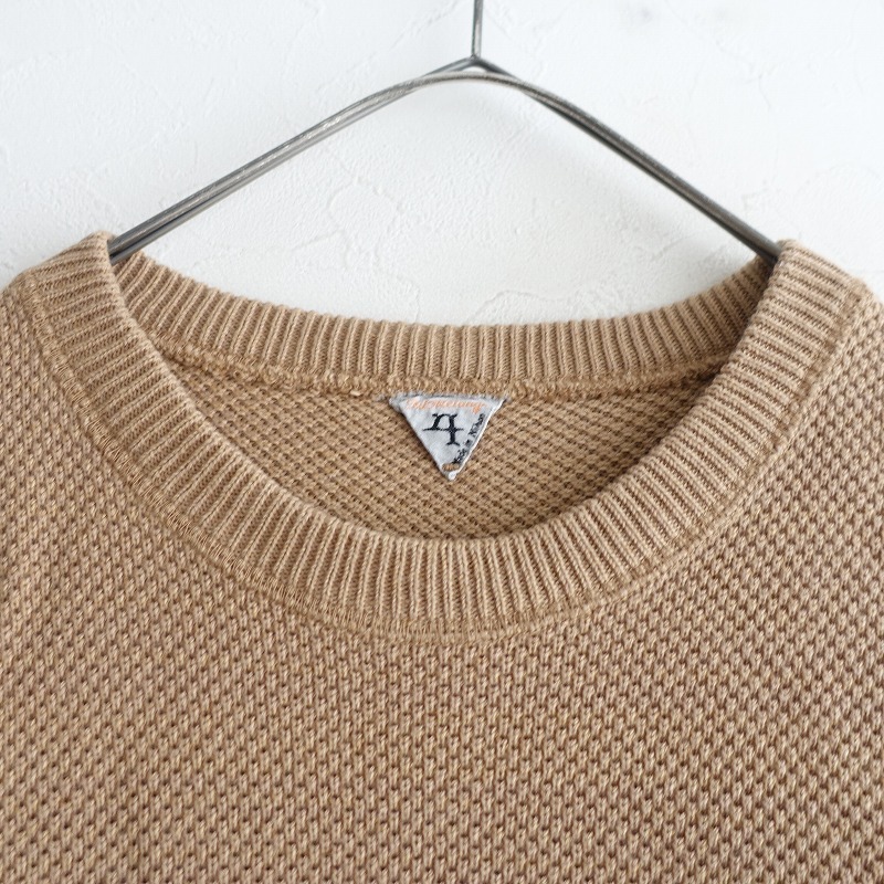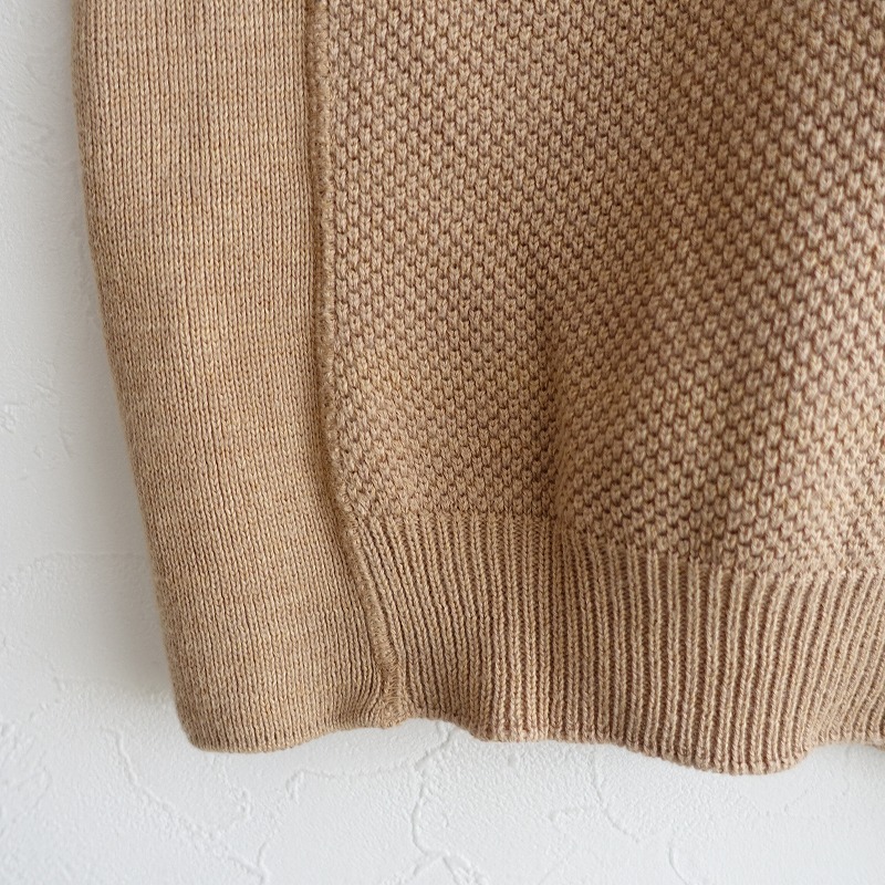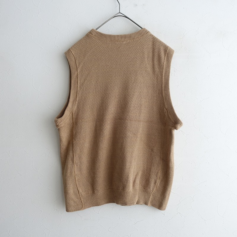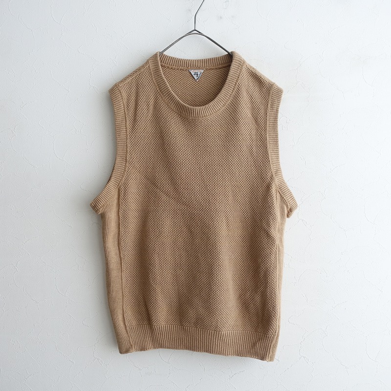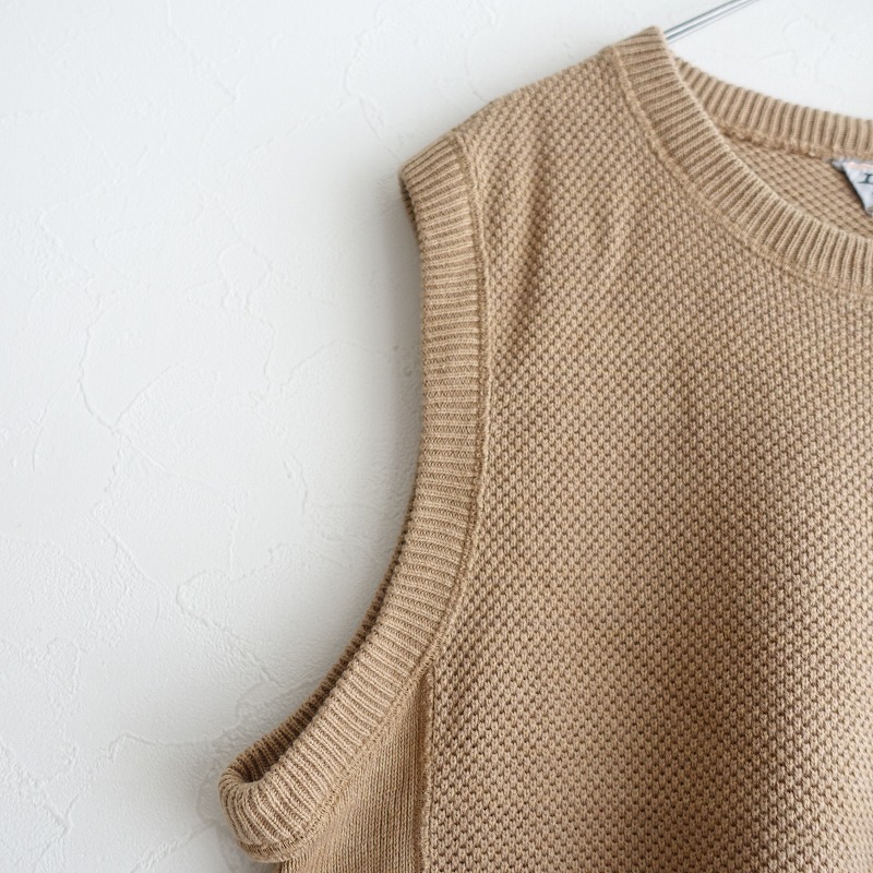 | FilMelangeのコットンニットベストです。カラーはベージュで、鹿の子編みのようなニット素材で仕立てられ、サイドはリブ編みになっております。プルオーバータイプの着脱です。 |