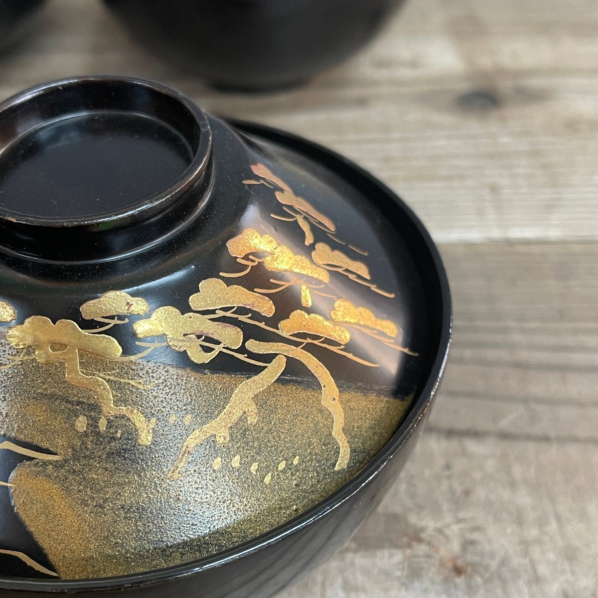 商品名:漆器 お椀 黒塗 金彩 松 風景画