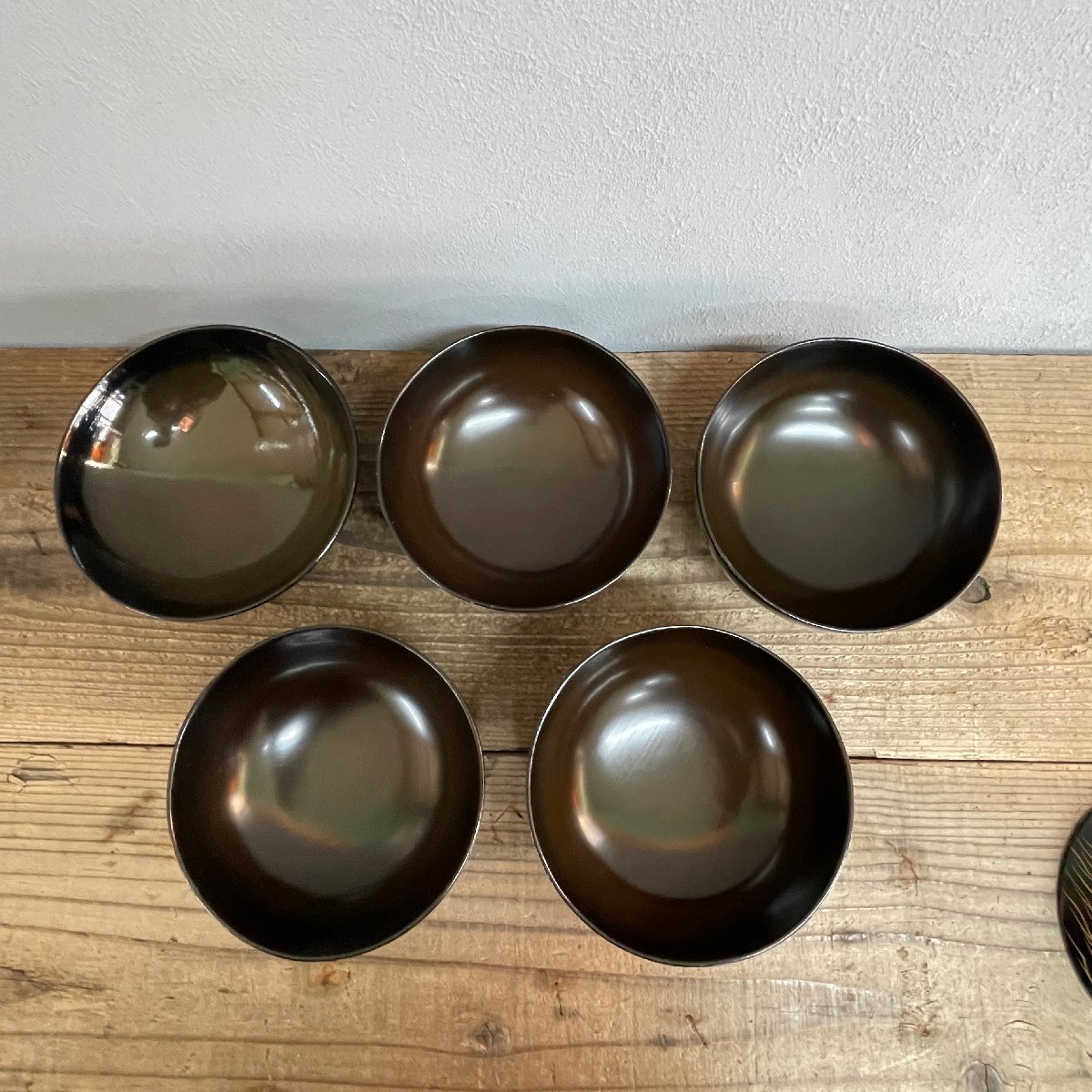 骨董 時代物 碗 漆器 お椀 黒塗 金彩 松 風景画★5客