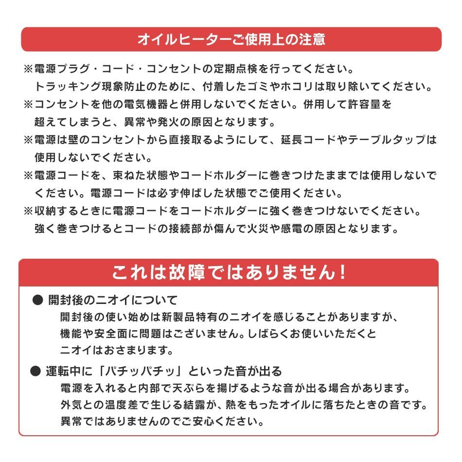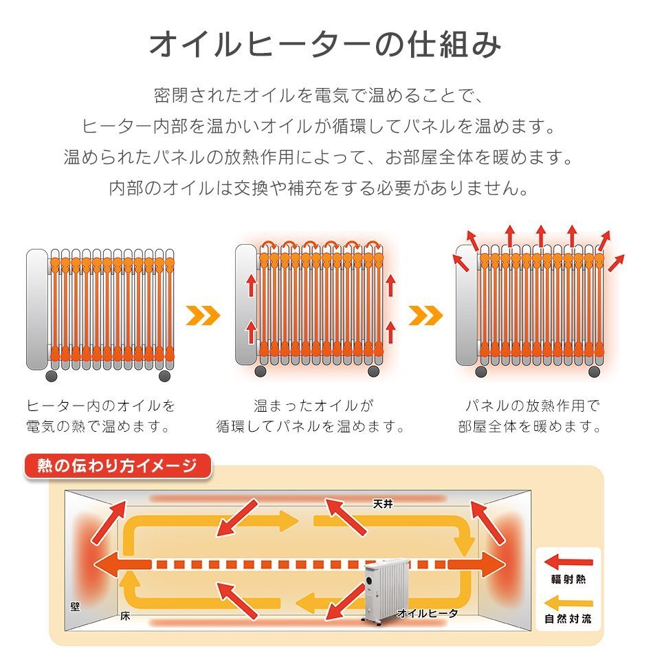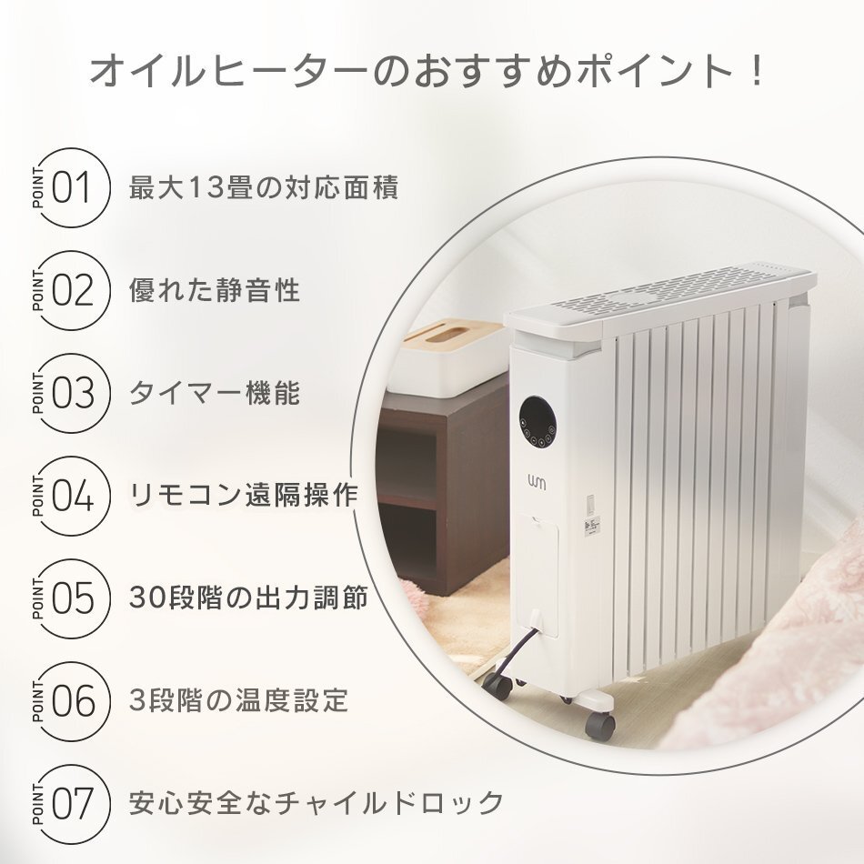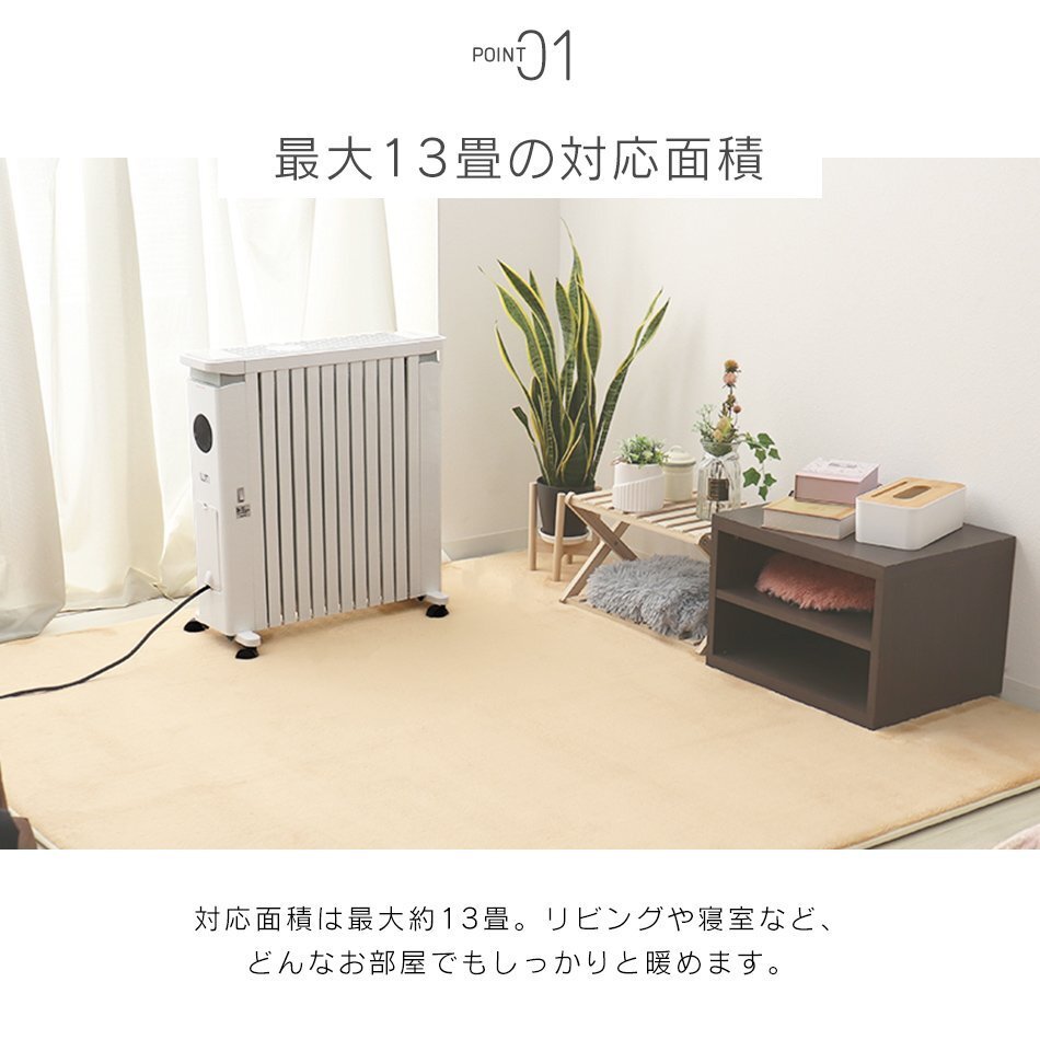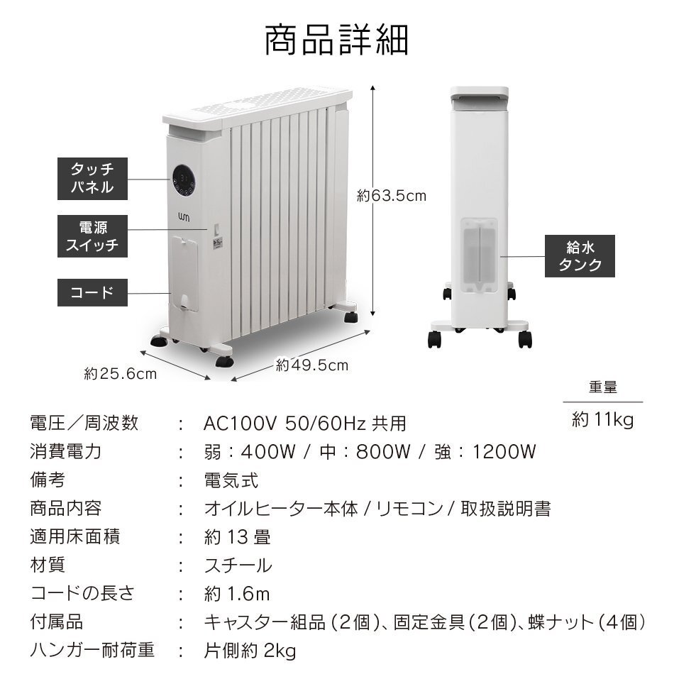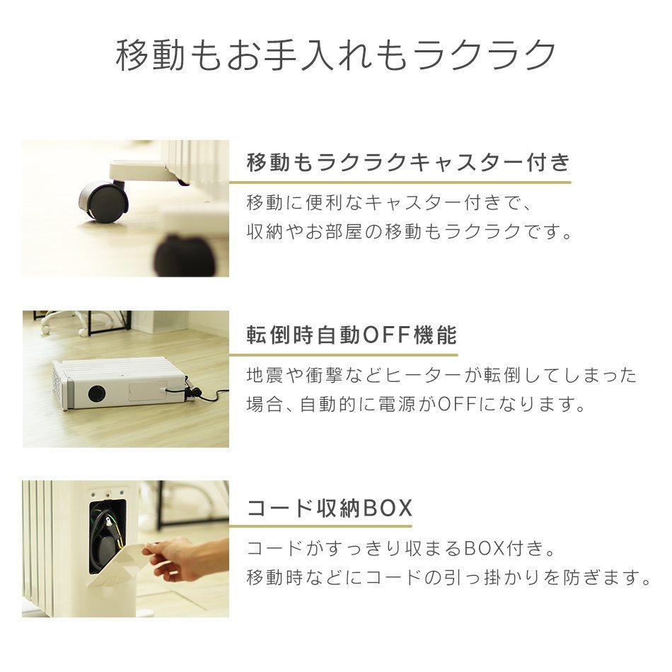 「乾燥しない、換気不要、燃料の補充不要、臭わない、静か」と嬉しいポイントが盛りだくさんのオイルヒーター。 対応面積最大13畳!優れた静音性でリビングや寝室など、 どんなお部屋・場所でもストレスなくご使用いただけます。 30段階の温度設定、3段階のモード設定が可能! 寒さに合わせてお好みの暖かさに調整できちゃいます♪ もしもの時も安全! 転倒時自動電源OFF、操作制限できるチャイルドロックの安全機能を完備。 タッチ操作可能なデジタル表示パネル搭載! 便利なリモコン付属。立ち上がることなくソファやベッドにくつろいだまま操作できます。 本体に収納可能な物干しハンガー付き。 タオルや衣類を暖めて乾かせます! その他、加湿機能やタイマー機能、コード収納など使い勝手抜群です☆ ■商品コード:NBC001WH ■商品仕様 サイズ:(約)幅25.6×奥行49.5×高さ63.5cm 重さ:(約)11kg 適用床面積:13畳 電源:AC110V 50/60Hz 消費電力:(強)1200W、(中)700W、(弱)500W フィン:12枚 コードの長さ:(約)1.6m 材質:スチール ■商品内容 本体、リモコン、取扱説明書 ※付属品:キャスター組品(2個)、固定金具(2個)、蝶ナット(4個) ■注意事項 ・不安定な場所や熱に弱い敷物の上で使用しないでください。 ・商品は、モニターによって色合いが異なって見える場合があります。 ・仕様・デザインは改良のため予告なく変更することがあります。 ■保障期間 1年間 詳細はこちら 【もちろん新品未使用品です】 |