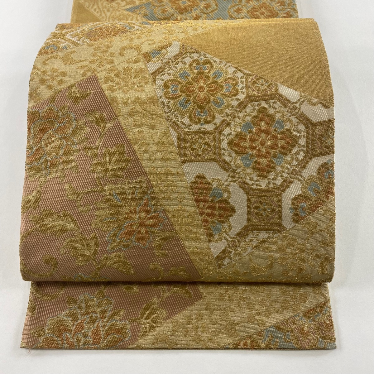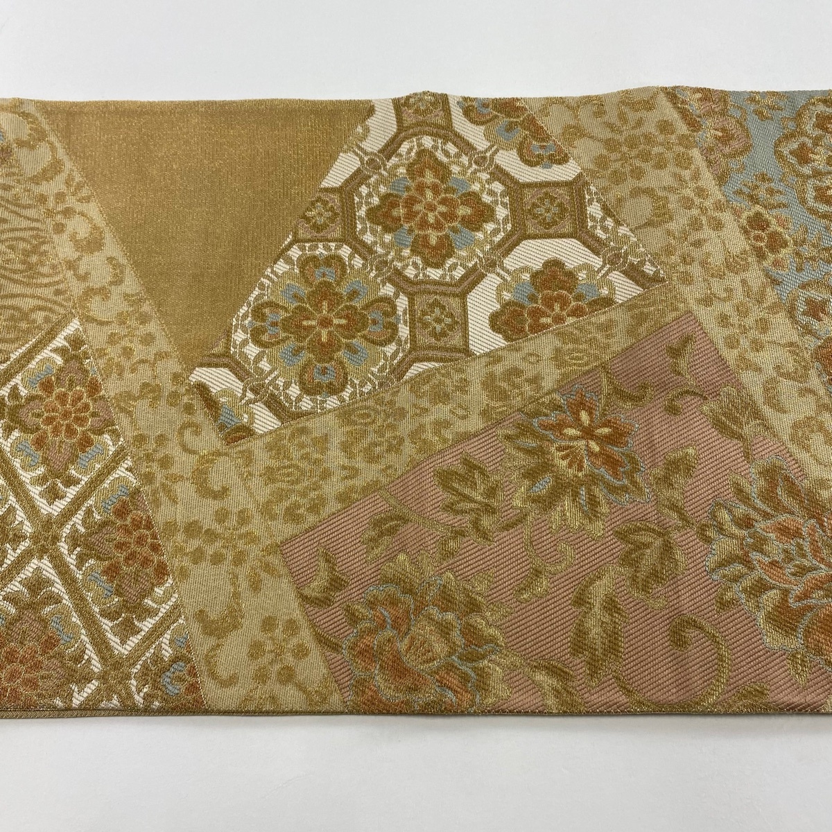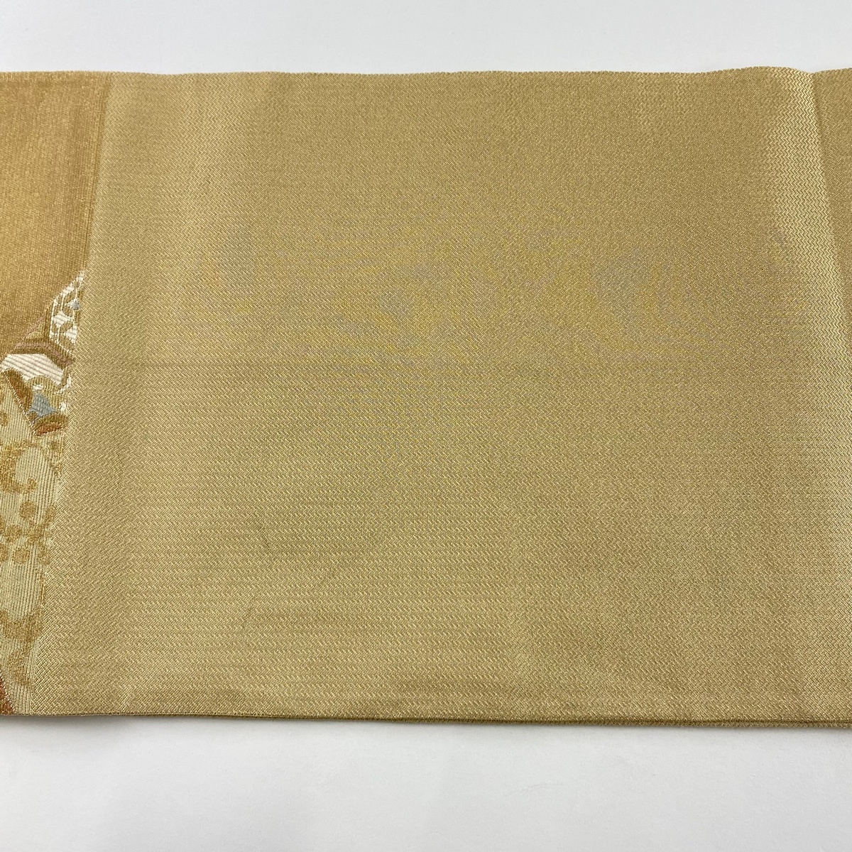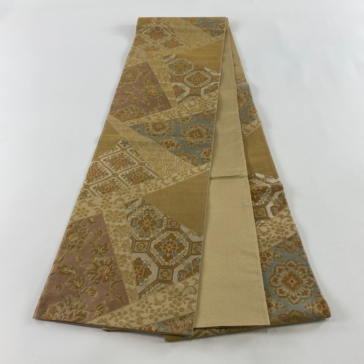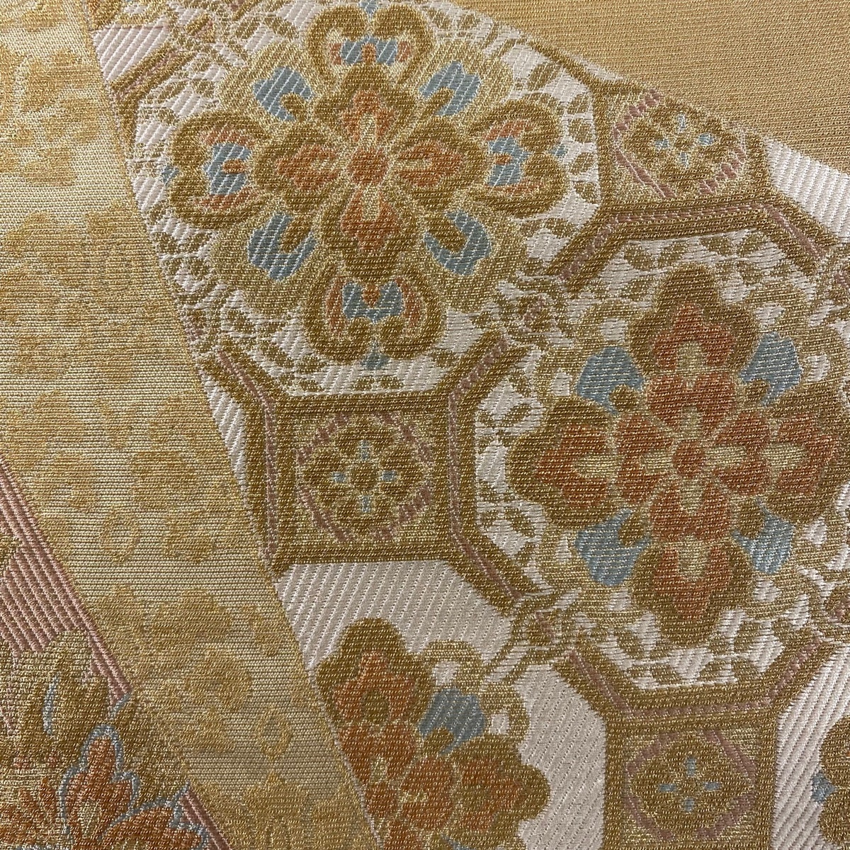 | 袋帯 名品 蜀江華文 裂取り 輪奈織 金糸 薄茶色 六通 正絹 【中古】 |