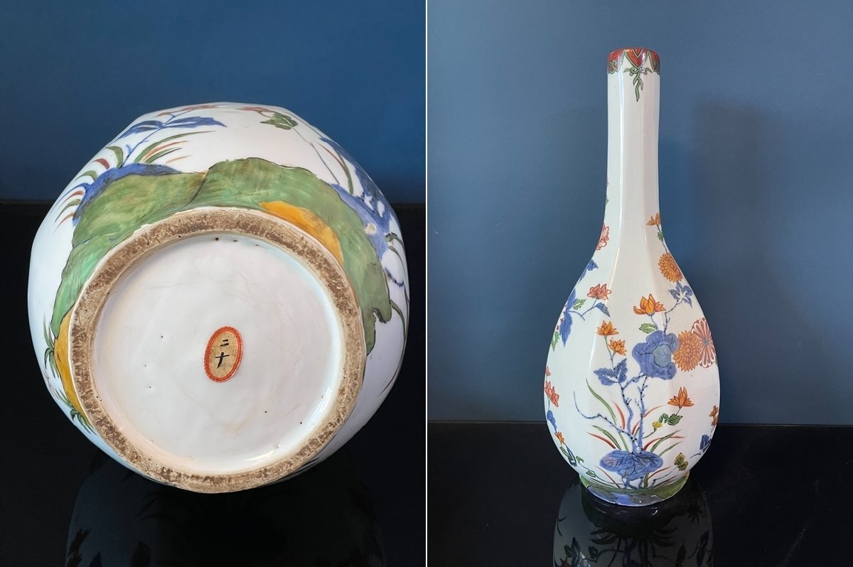 美しい濁し手となる生地にコバルトブルーの藍色と赤絵にて絶妙なる垢抜けた彩色に仕上がりを魅せる初期柿右衛門の手による無類の大花瓶となっています。八角の面取りが洗練味を醸し出し大名家の二十の蔵番が残されている無疵完品です。