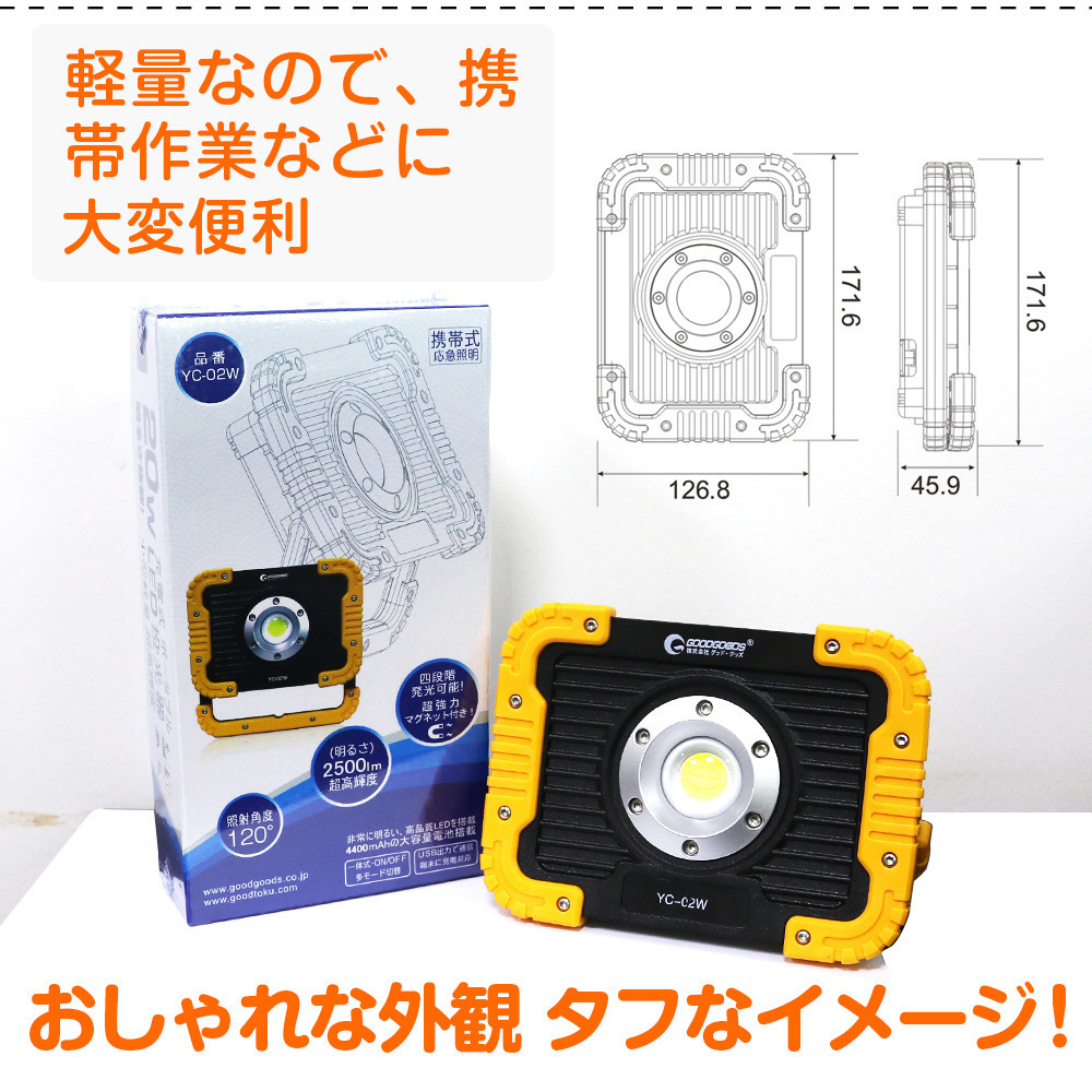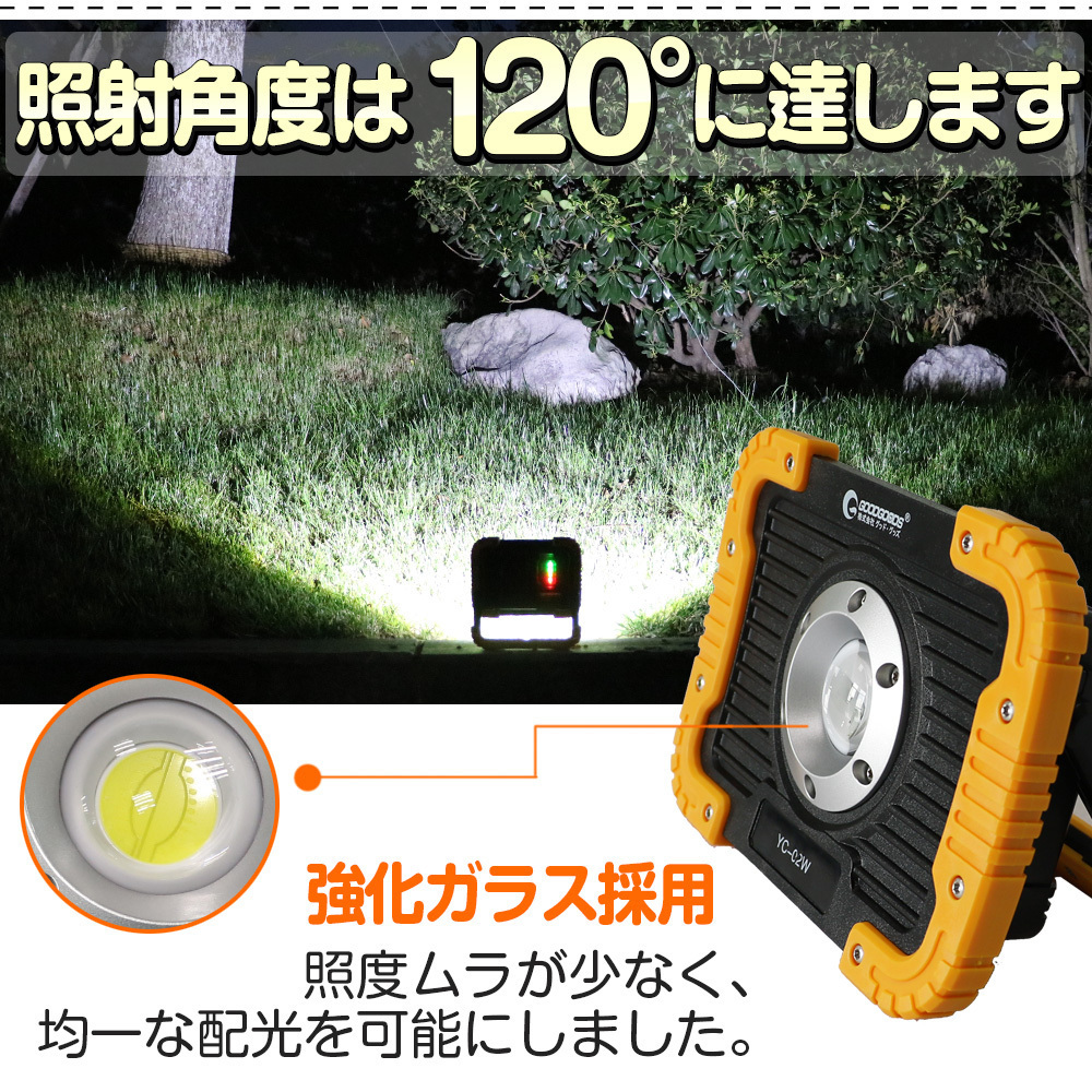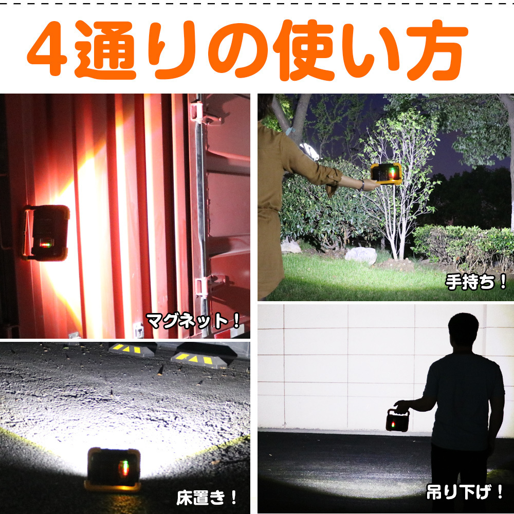 | ★オススメポイント★ 【実用新案登録】 【折り畳み式:コンパクト・小型なデザインで持ち運びに非常に便利です】 コンパクト:小型なデザインで重さが0.45Kg、カバンに入れても軽量なため大変安心。 小型且つ軽量化タイプなので、持ち運びに非常に便利です。 LED作業灯、ランタンと懐中電灯の機能を持ちます 【20W COBタイプLEDを実装して、直視できない程の眩しい光を照射。】 LED COBチップが設置され、均一なひとつの面で発光するため、直視できない程の眩しい光を照射。 120°の広角照射と相まって、より幅広い範囲を真昼の如く照明できます。 【ワンタッチで点灯4モード切替可能!】 ハイ・ロー・SOS・フラッシュ4モードを搭載! ハイ・ローモード:使う場所や時間帯によって用途に合った使い方ができる。 SOS・フラッシュモード:イザというときに役に立つ! 【強力マグネット付きで様々なシーンで活躍すること間違いなし!】 マグネットが付いており、、鉄などの金属に吸い付けます。引っ掛けて使用する事もできます。 作業するとき、両手が解放され、作業も快適なワークに楽! 前後180度の方向が調節することができます。照明の方向が調整することができます、仕事のときには働きやすいです。 【耐衝撃、耐振動、丈夫な設計で安全、安定性、信頼性の高い!】 2Mからの落下にも耐える丈夫な構造で手の不注意で商品を落とす不安不要! 【設計にヒューマナイズ!バッテリー残量表示灯&充電表示灯を搭載!】 電量残量表示灯と充電量指示灯を組み込んだ設計です。表示は25%、50%、75%、100%の4段階です。 電池電力表示ライトも付き、電力が少なくなることがすぐに分かるため予め充電準備可能。 【モバイルバッテリー機能:スマホや携帯などに充電対応できる】 USBコネクターを連続して、USB給電可能なiPhone、iPad、スマホ、Tablet、WiFiルータ、ゲーム機等の充電が可能。 ※USBで利用して充電できるなら全部OKです。 【IP65防塵防水規格】 PC材質を強化しIP65相当の防塵・防水性能を保証、雨の当たる屋外や粉塵の多い環境でご使用頂けます キャンプ・アウトドア、災害時の非常ライト、製造ライン 自動車整備、工事現場、倉庫作業、トラック荷台作業などに |