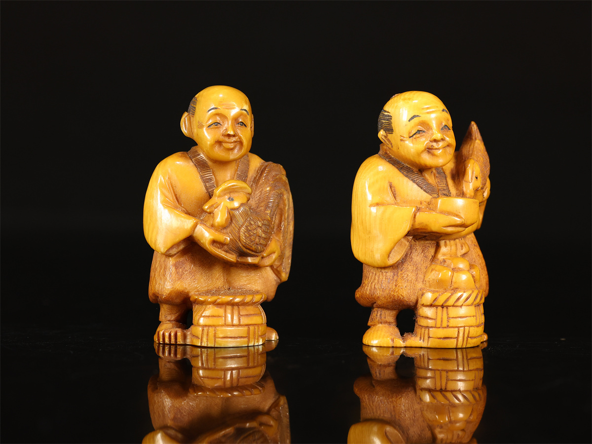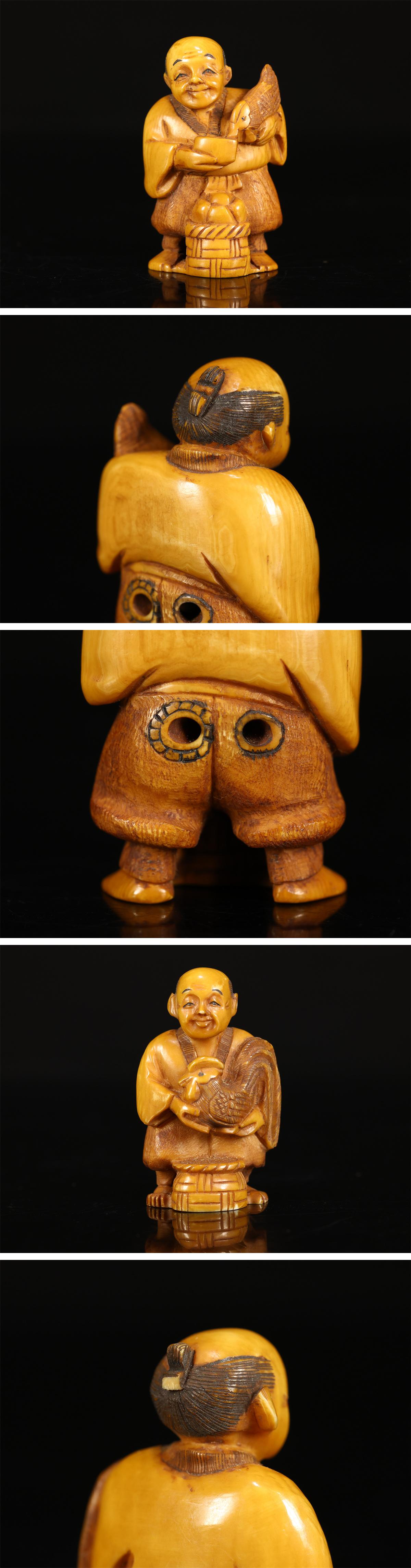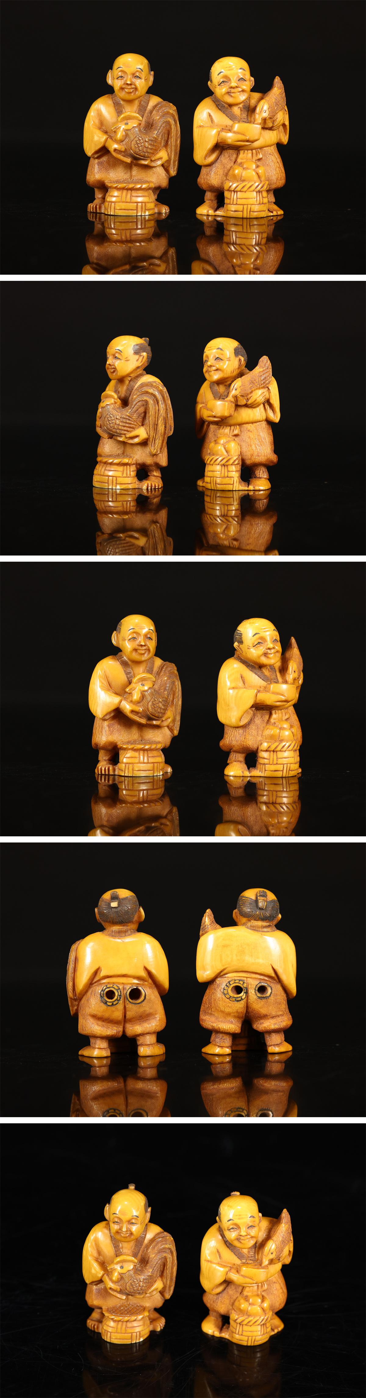 久1326 時代 東洋彫刻 【光月銘】 鶏を抱く人物 根付 2点 一対 美品