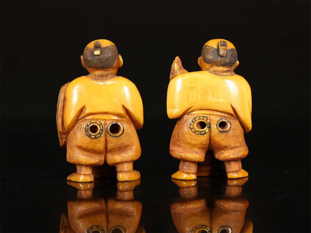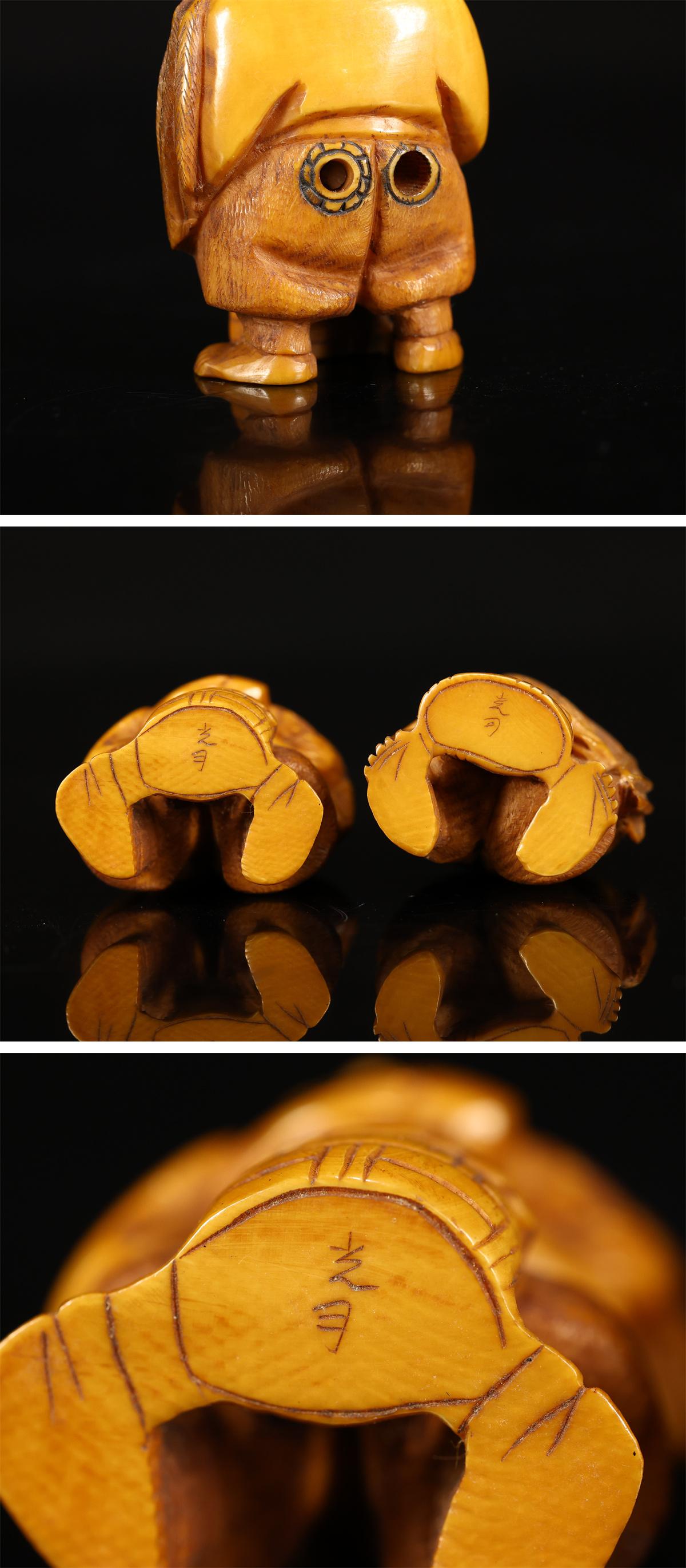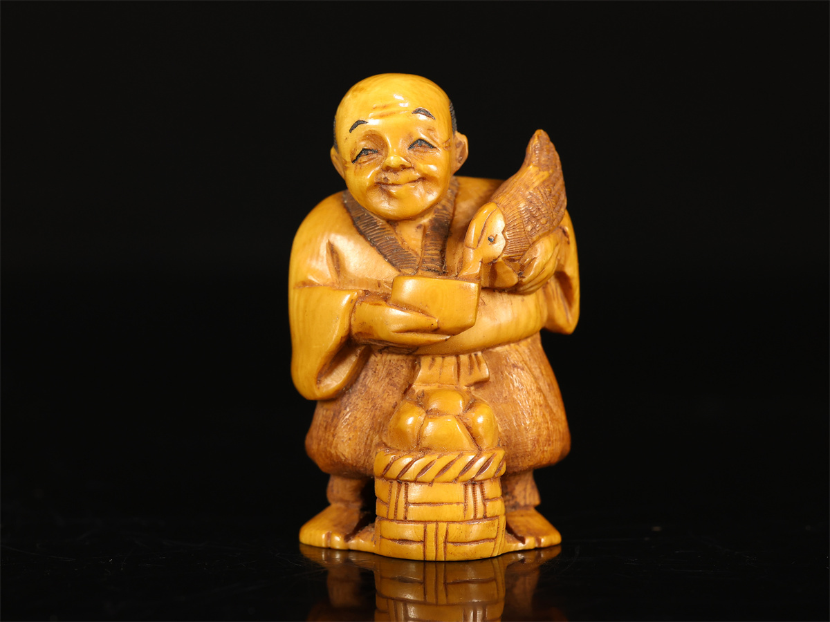久1326 時代 東洋彫刻 【光月銘】 鶏を抱く人物 根付 2点 一対 美品