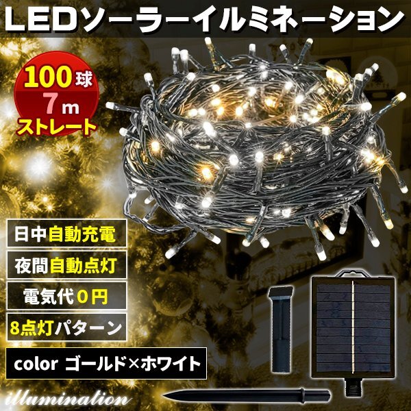 ソーラー イルミネーション 屋外 クリスマス ストレート 屋外用 イルミネーションライト 100球 ゴールド×ホワイト