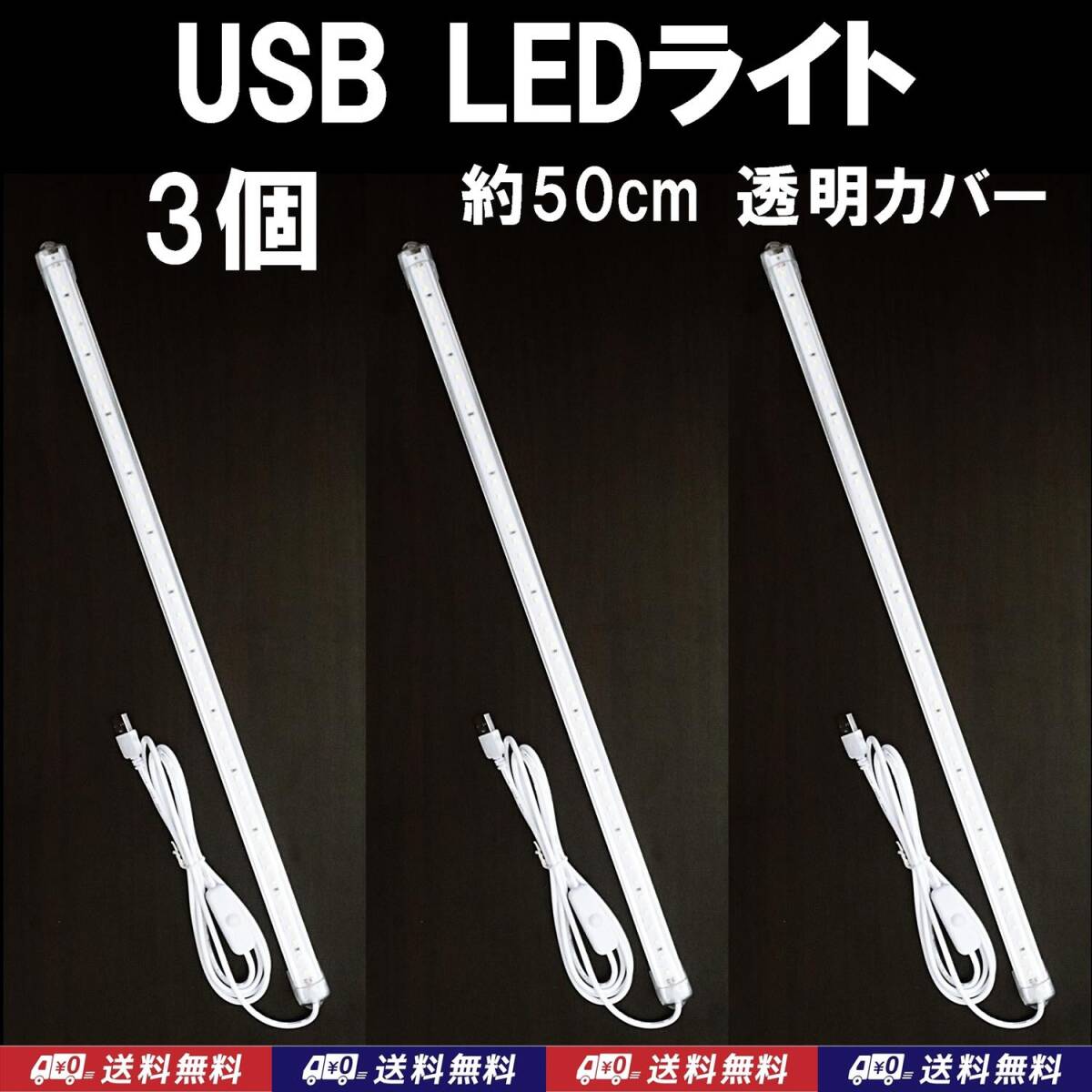 【送料込】USB LED バーライト 約50cm(LED48個) 3個 透明カバー 金魚・メダカ・シュリンプ水槽に 停電時の非常用やキャンプの照明に