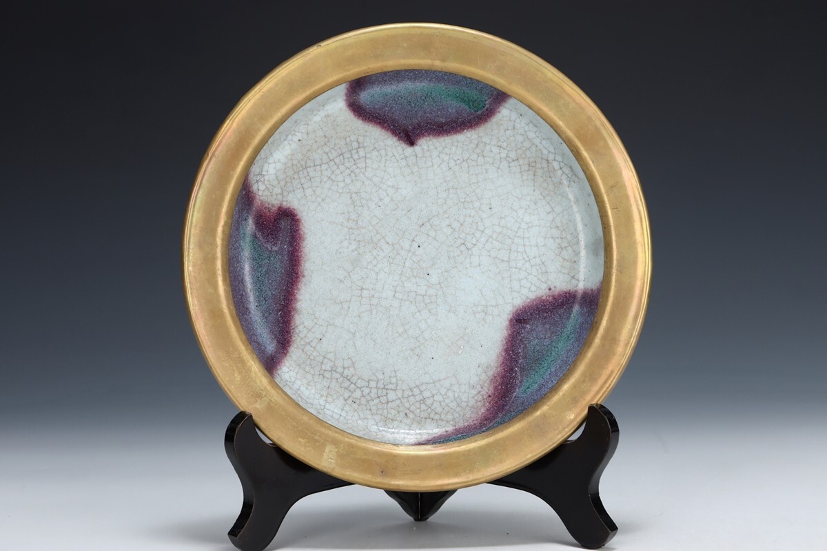 「宋 鈞窯 陶磁器 紫紅斑 折沿盤」染付 置物 擺件 古賞物 中国古美術 旧蔵出