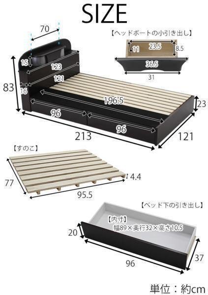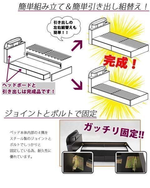 | 商品紹介 | ○大人気のベッドシリーズ!! ●ベッド下に大型収納の引き出しが2つ設置されています。 ●ヘッドボードにはLED照明ライト、電源コンセントを2個口、 小引き出しを完備。 ●桐のすのこを採用し、通気性も◎。 ●素材:MDF(ベッド本体) 桐(すのこ) LED(照明ライト) ●塗装:PU塗装 ●LED消費電力:5ワット ●電源コンセント(2個口):合計で1500ワットまで使用可。 ●電源コンセント用プラグが1本(長さ約170cm)と照明ライト用が1本(長さ約166cm)付属。 ●重量:約67kg ※こちらの商品は、組立て式です(組立てに必要な工具は付属しています)。 |
