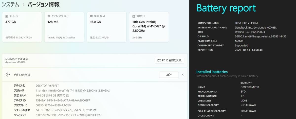 | ⭐商品特長⭐ ✅2021年製、14型サイズで、質量が約1.47kg。PCの主流である15.6型のノートPCよりも、コンパクトで、軽いので、扱いやすく、持ち運びや収納がしやすいです。オフィスや店舗内で場所を固定せずに使いたい方や、宅内の自由な場所で日常用途に気軽にパソコンを使いたい方に適した機種 ✅第11世代インテルCoreシリーズCPU搭載、M.2タイプSSD512GB+メモリ16GB内蔵。ビジネスはもちろん、プライベートでも十分な性能を発揮できる ✅天板、パームレスト、底面、側面、液晶フレーム、タッチパッドには、抗菌剤入りの塗料や、コーティング材料が使用されています。また、キーボードの各キー樹脂には、抗菌剤が練りこまれています ✅充実のインターフェース:有線LAN、無線LAN、microSDカードスロット、HDMI、USB Type-A、USB Type-C標準搭載 ✅無線LANはIEEE 802.11ax(Wi-Fi 6)に対応、サクサクな高速WIFIが実現可能 ✅顔認証(Windows Hello)対応Webカメラ標準搭載 ⭐商品特徴⭐ ✅Windows 11 Pro 64bit搭載 ✅正規マイクロソフトオフィス:Microsoft Office 2021 Pro Plusインストール&ライセンス認証済【プロダクトキー付属】 ✅「Windows defender」搭載 ⭐プレミアム仕上⭐ ✅(正規)OSやオフィスをセットアップ、インストールがすべて完了 ✅高速なSSD(ソリット・ステート・ドライブ)搭載 ✅AOMEI OneKey Recoveryアプリをインストール済、いつでも利用可能 ✅あったら便利なアプリを厳選して、インストール済です。届いたらすぐ使えます ⭐商品スペック⭐ ⭕メーカー:dynabook ⭕型番:dynabook MZ/HSL(2021年6月発売モデル) ⭕OS:Win11 Pro 64bit ⭕オフィス:Microsoft Office 2021 Pro Plus【プロダクトキー付属】 ⭕CPU:Core i7 1165G7 2.80GHz ⭕RAM:16GB(8GB×2)/32GB PC4-25600(DDR4-3200)対応 SDRAM、デュアルチャネル対応 2スロット ⭕SSD:512GB SSD(PCIe対応) ⭕Webカメラ:内蔵(有効画素数 約92万画素 WindowsHello対応(Webカメラシャッター付き)) ⭕ディスプレイ:14.0型ワイド(16:9)FHD 広視野角 TFTカラーLED液晶(ノングレア)(省電力LEDバックライト)1,920×1,080ドット ⭕グラフィック:Intel Iris Xe Graphics ⭕通信機能:Wi-Fi 6(IEEE802.11ax)(2.4Gbps)+IEEE802.11ac/a/b/g/n準拠 + Bluetooth 5.1 ⭕インターフェース:microSDカードスロット、マイク入力/ヘッドホン出力端子×1、USB3.1(Gen1)Type-Aコネクタ×2、Thunderbolt 4(USB4 Type-C)コネクタ×2、LAN(RJ45)×1、HDMI出力端子×1 ⭕外形寸法:約323.6(幅)×220.6(奥行)×19.9(高さ)mm ⭕質量:約1.470kg ⭕付属品:純正ACアダプター&ケーブル ⭐バッテリの状態⭐ <Battery Report>で検査しました バッテリーの容量値:53,130mWh バッテリーの残量値:30,615mWh 残量:58% (30,615/53,130*100%)(JEITA2.0 約8時間) ⭐商品状態⭐ ※評価は「主観」になります。程度の捉え方には個人差が有ります。ご理解の程、よろしくお願いいたします※ ⭕天板:使用に伴う小傷がございますが、状態綺麗 ⭕キーボード:キーテカリがありますが、傷、剥げ等なく、状態綺麗 ⭕パームレスト:状態綺麗 ⭕液晶:傷やムラ等なく、発色良好 ⭕その他:目立った不具合等ありません ⭕総合:中古品のため、使用に伴う小傷等がありますが、全体的に状態が良く、美品です | |||
