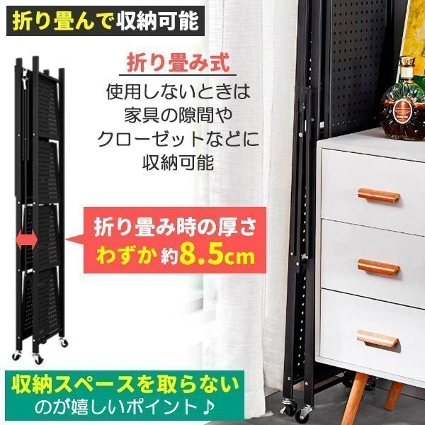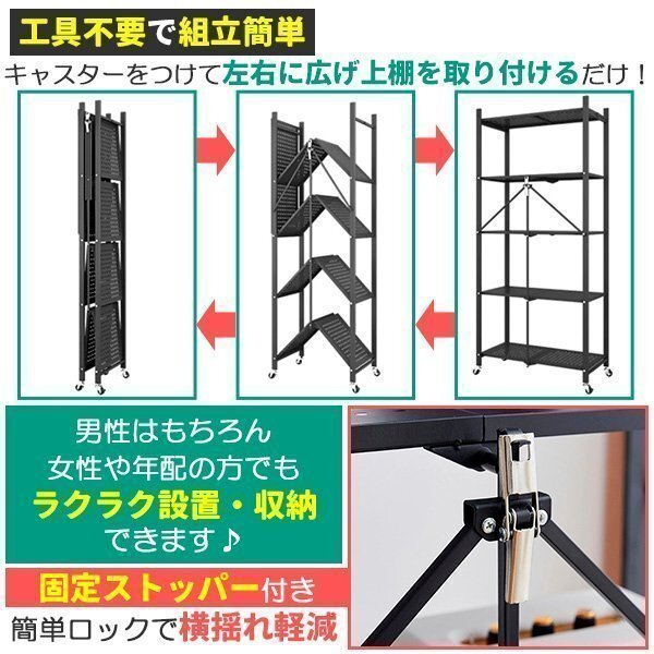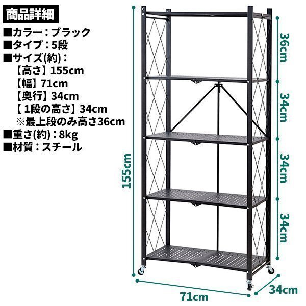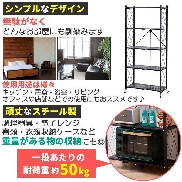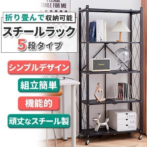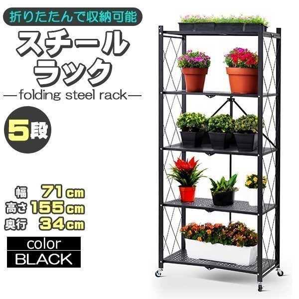 収納ラック 棚 金属シェルフ スチールラック メタルラック 折りたたみ 折り畳み スチール棚 キャスター付 組立簡単 頑丈 ブラック 黒 5段