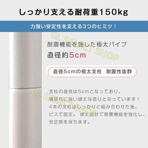 • しっかり支える耐荷重150kg 力強い安定性を支える3つのヒミツ! 安心設計1 直径5cmの極太支柱 耐震性抜群 支柱の直径は5cmとなっており、横揺れに強い頑丈な造りとなっています!4本の支柱はしっかりと組み合わせた後、ビスで固定。 頑丈設計で耐震機能を強化し、安定感を保ちます。