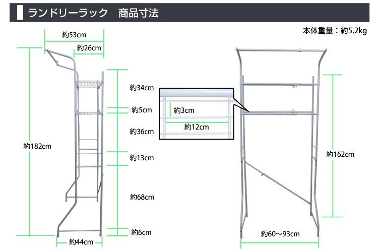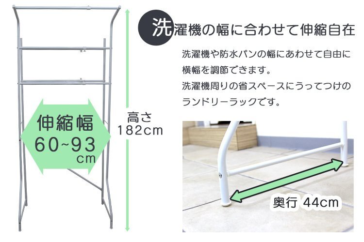 洗濯機やトレイなどの環境に合わせて幅が伸縮するのでピッタリサイズで使えます。 洗濯機から、洗濯物を干す時に便利なハンガーラック付き!外に出す前に一時的にハンガーラックで洗濯物を掛けられるので便利です。 ネット棚2枚付きで洗剤などの小物も置きやすいです。 アジャスター付き。 【商品仕様】 カラー:ホワイト サイズ(約):幅60~93cm×奥行53cmx高さ182cm 重量(約):5.2kg 棚の奥行サイズ(約):26cm 耐荷重: ・棚:5kg×2段 ・ハンガー部:5kg 材質:スチール、ポリプロピレン 他 ※お客様組み立て商品です。 |