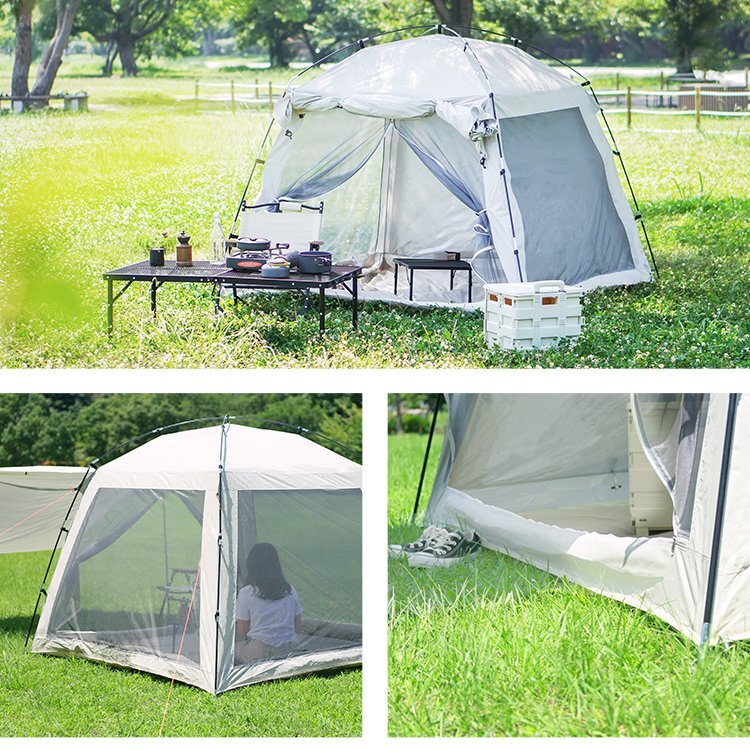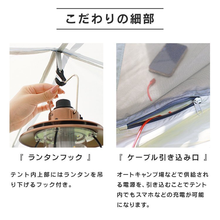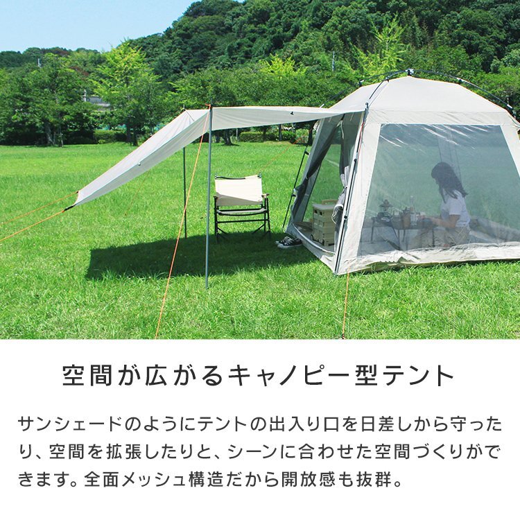 空間が広がるキャノピー型テント サンシェードのようにテントの出入口を日差しから守ったり空間を拡張したりと シーンに合わせた空間つくりができます コンパクトに収納できるので持ち運びも便利です ■広々としたテント内空間! 大人3人がゆったりくつろげる広々としたテント内部 天井も高く立ったまま活動ができるほど余裕あります ■虫も防ぐ全面メッシュ 風を通しながら虫の侵入を防ぐメッシュスクリーン、 ファスナーで簡単に開閉することができます。 ■シルバーコーティングで暑さ軽減! テント内部にはシルバーコーティングを施し強い紫外線でも テント内を心地よく保つことができます 【商品仕様】 カラー:ホワイト 商品内容: 本体用ポール2本、キャノピー用ポール2本、ペグ12本、ロープ8本、収納バッグ1点 サイズ: 使用時:(約)幅215cm×奥行215cm×高さ170cm 収納時:(約)20cm×60cm 重量:(約)4.7kg 材質:グラスファイバー 【注意事項】 ・テント生地には撥水加工が施されていますが、雨天・豪雨下での完全防水を保証するものではございません。 ・風速5m以上の風の吹く場所でのご使用は転倒や破損の原因になります。 ・設営の際は、2人以上で丁寧に作業を行い、しっかりと固定してください。乱暴に扱いますと、故障や破損の原因になります。 ・海外製品で、簡易梱包での輸入のため風防に擦れや多少の小キズなどがある場合がございますが、 商品自体には問題ありませんのでご了承下さい。 ・商品は、モニターによって色合いが異なって見える場合があります。 ・仕様・デザインは改良のため予告なく変更することがあります。 |