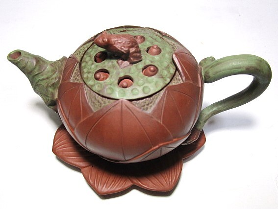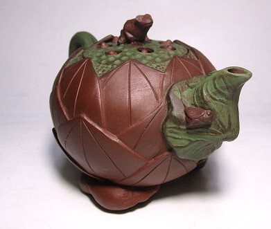 茶壷の胴は蓮の花で形作られています。  注ぎ口は小さな虫がとまる蓮の若葉です。