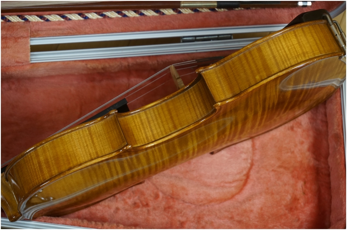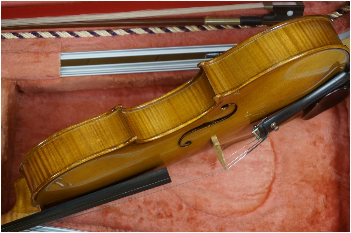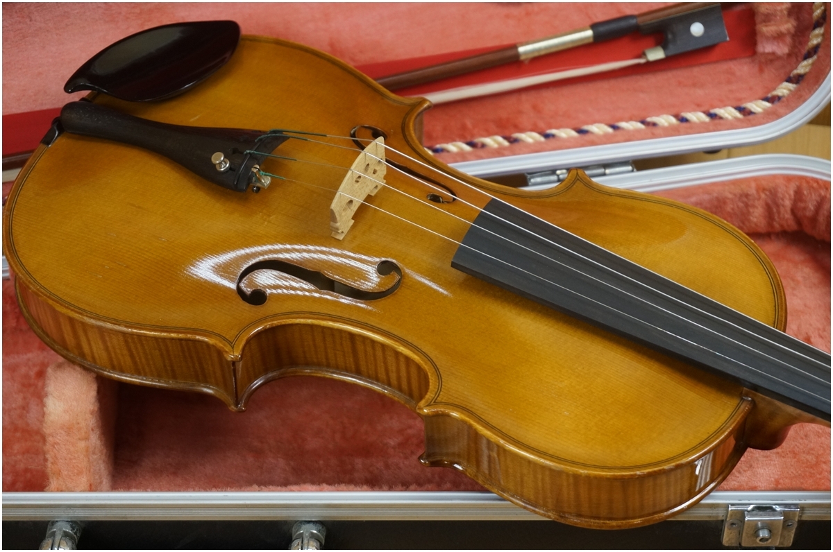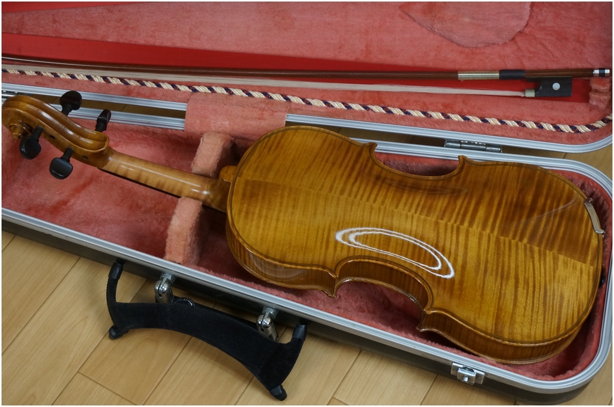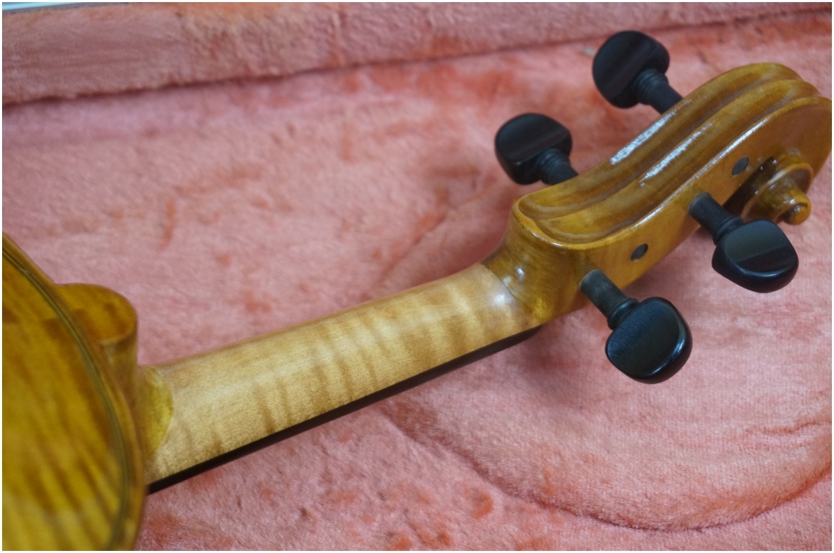 板に割れ・ヒビ・剥離など無く、杢目が非常に鮮やかです。表面にはニス本来のしっかりとした艶がございます。ペグの動きスムーズで、魂柱も立っており、コマにも問題は無いようです。