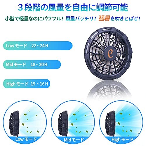 【1ボタンでひんやり 快適な夏を過ごします】ファン付き作業服用ファンセットは1ボタンで3段階の風量を自由に切り替えます。1回短押すと強風モード、もう1度短押すと快適な風のモード、もう1度短押すと自然風のモード、もう1度短押すとオフになります。ファン付き作業服用のバッテリーだけではなく、市販の全ての5V 20000mAhバッテリーが接続できて、本当に便利です。強風のモードは16時間、快適な風のモードは20時間、自然風は24時間使えます。猛暑の夏はエアコンが使えない所も1日中涼しくに過ごします。