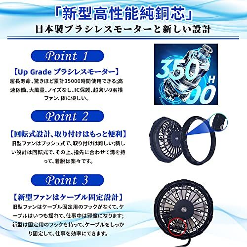 【こだわり品質 たくさんのお客様が選んだ品質】高耐久素材と智能な部品と相まって、素晴らしい品質の製品を作ります。ファン付き作業服用ファンの殻は上質な高分子ABS素材を採用し、耐衝撃、耐高温、耐久性も素晴らしいです。ブラシレスモータの内蔵ICチップと接続ケーブルのICチップの二重の智能保護を通して、過大電流と短路などを避けて、ファンの使用寿命を大幅に伸ばします。電源供給ケーブルの内層は純銅の20AWGを採用して、導電性能は本当にいいです。ケーブル外層は上質なPVC素材を採用し、10000回以上の折り曲げテストを通しました。耐久性も素晴らしいです。