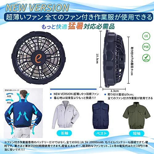 【サイズ・仕様、5Vの電源バッテリー対応、超省エネルギー】ファン付き作業服用ファンの厚さは3.3CMで、重量約105g、薄型軽量で着心地はもっと快適です。内径9cm、外径10.5cmの標準仕様です。すべてのファン付きウェアに完璧に対応可能です。必ず出力5Vの電源バッテリーを使用してください、出力5V以上の場合はファンが破損する恐れがあります。出力5V以下の場合は風量が弱くなったりすることがあります。省エネルギー、経済的なファンセット、1ヶ月の電気代はただ19円!!!本当に安いです!!!