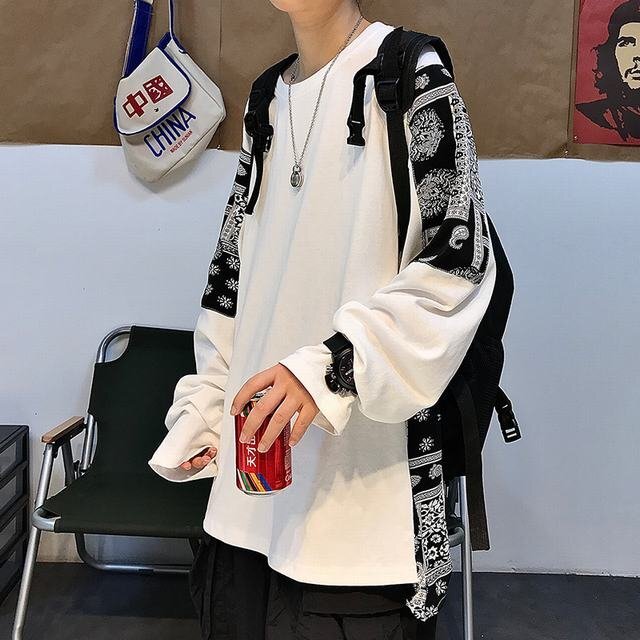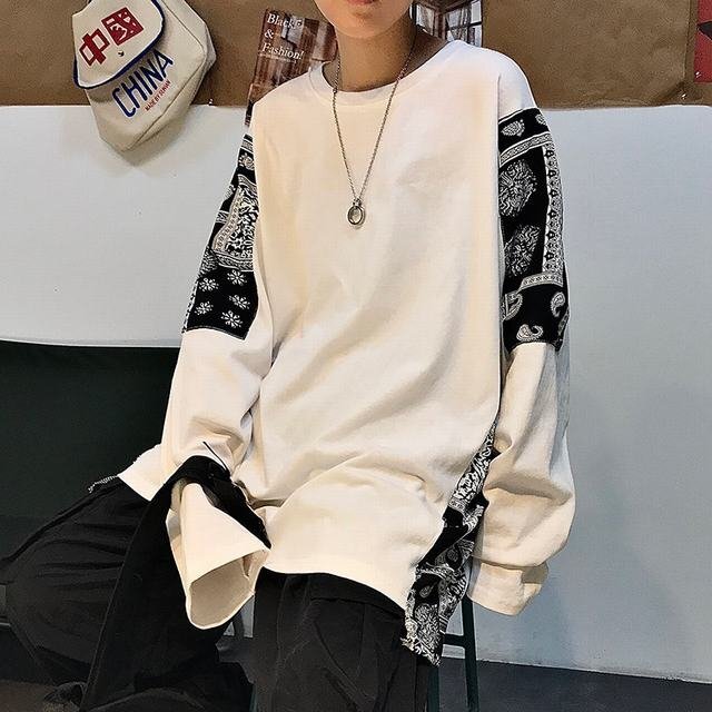 Tシャツ カットソー トレーナー スウェット 長袖 クルーネック ロンティー ロンー柄 バンダナ柄 オシャレ ホワイト L