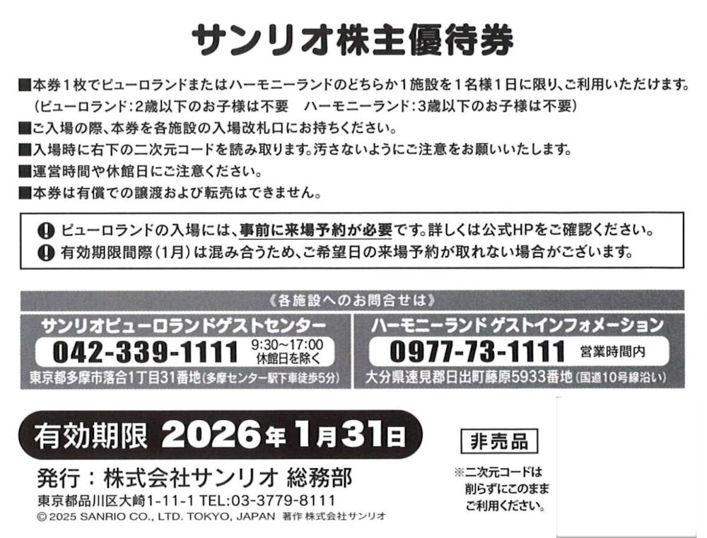 サンリオピューロランド、ハーモニーランド 株主優待券5枚
