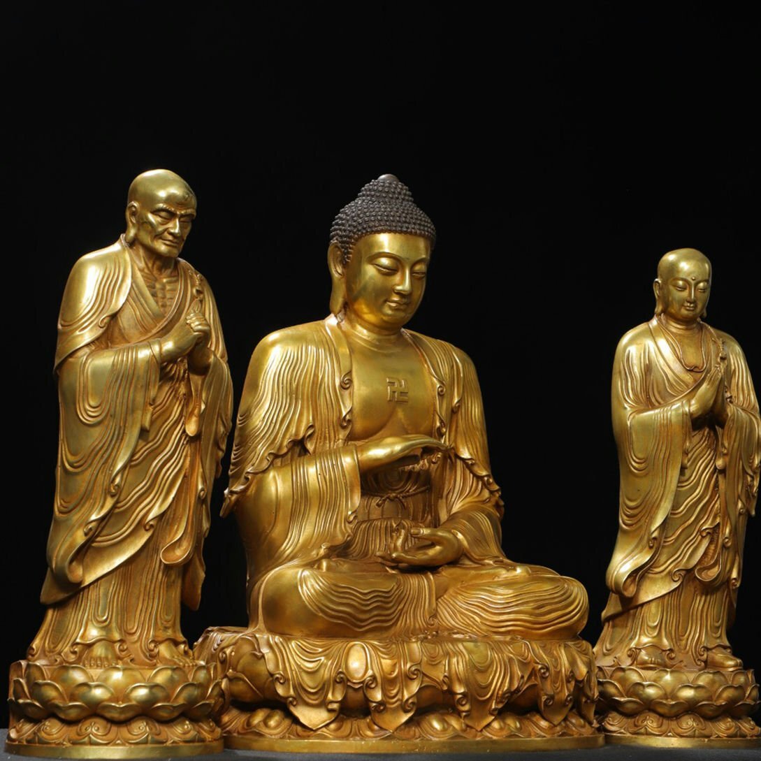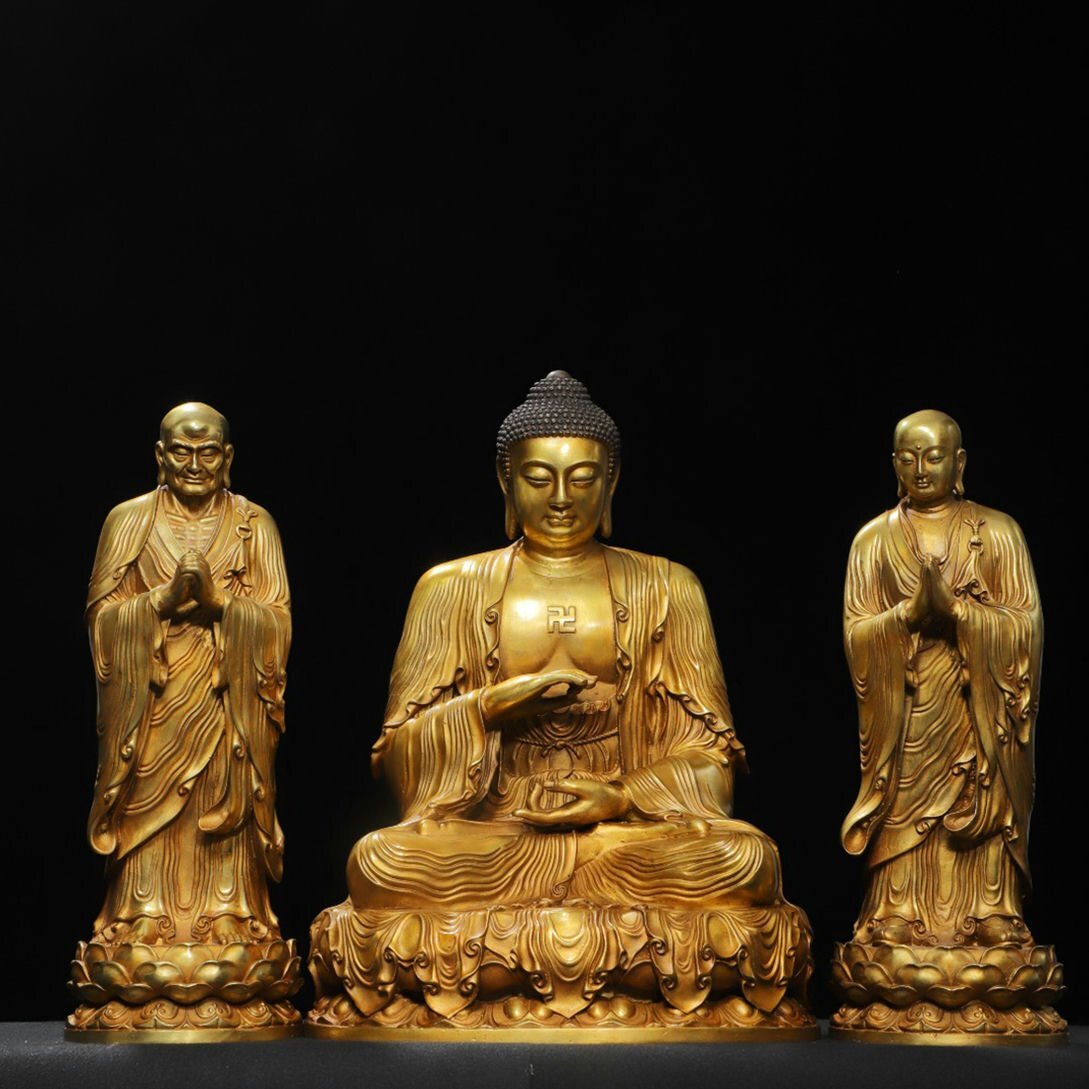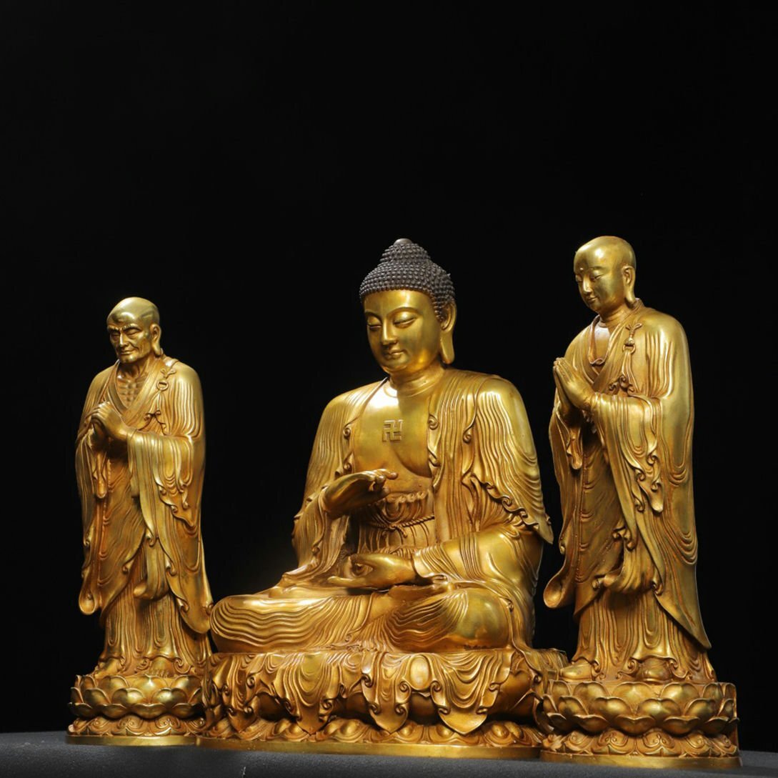 【サイズ】主仏高さ43cm 横幅30cm 奥行き25cm、 二弟子高さ38cm 横幅14cm 奥行き14cm 重さ10.26kg