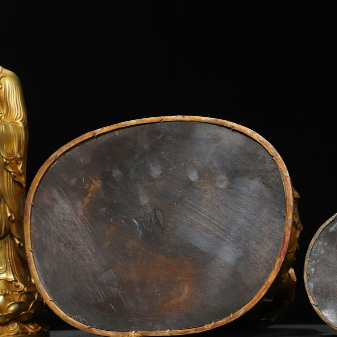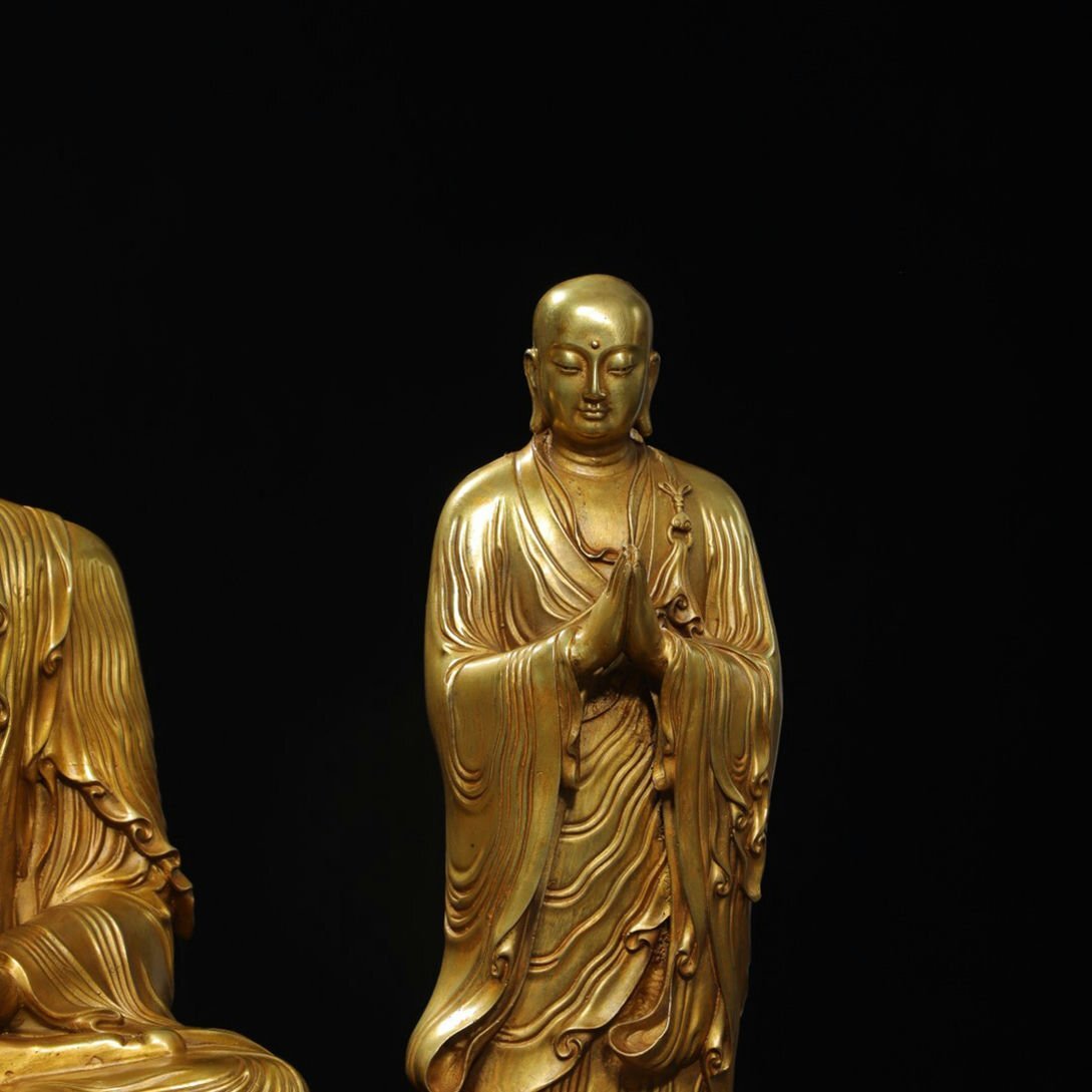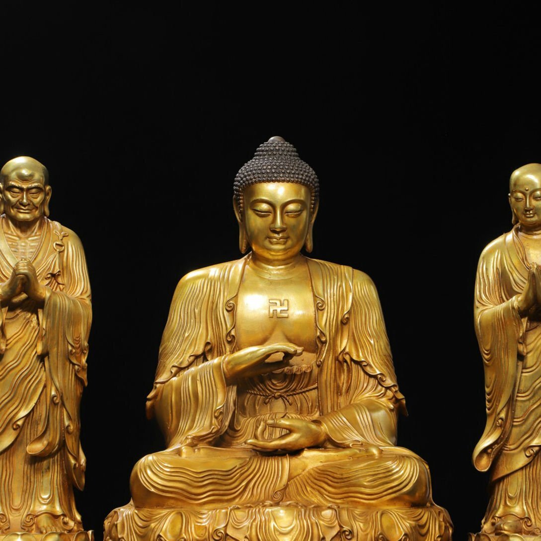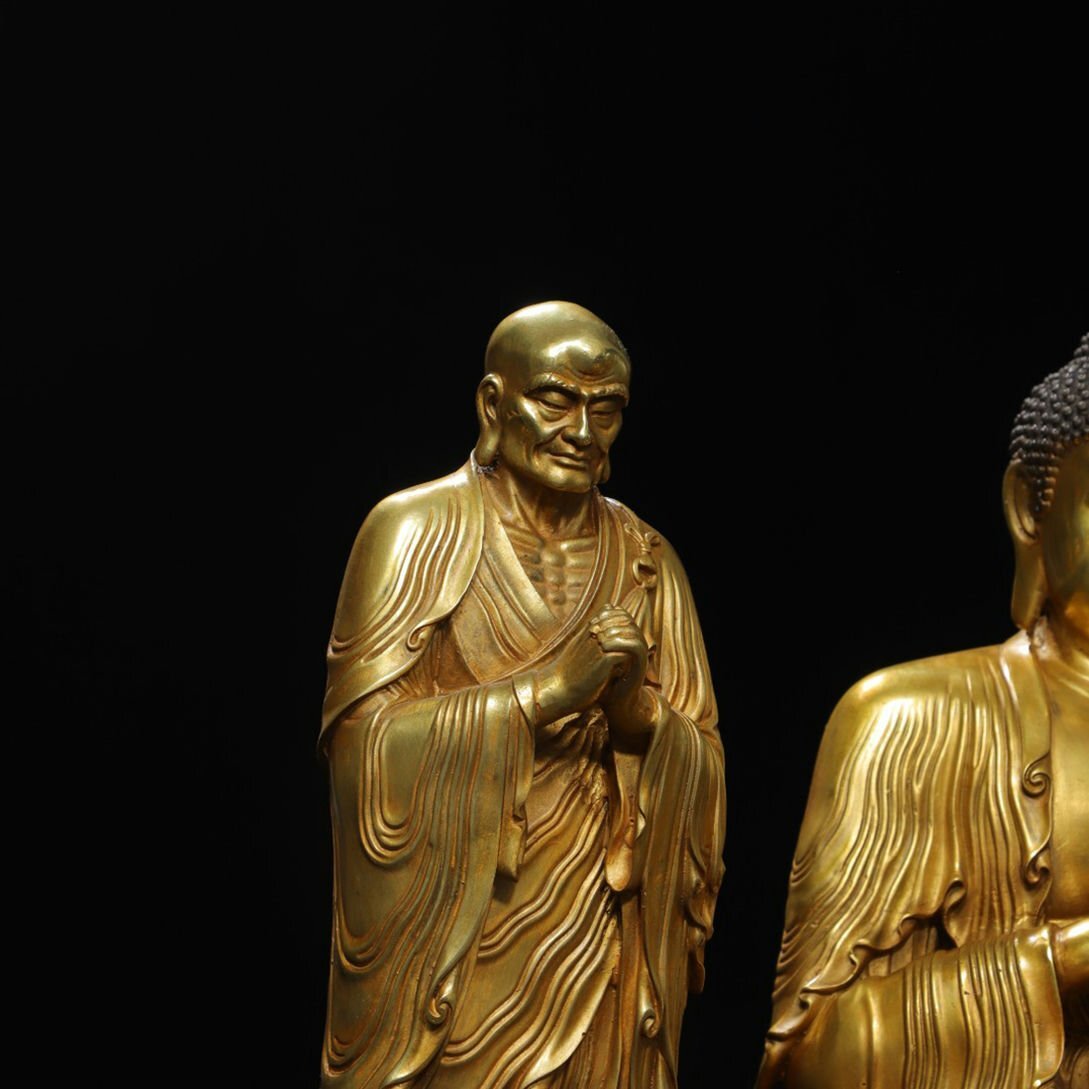 【サイズ】主仏高さ43cm 横幅30cm 奥行き25cm、 二弟子高さ38cm 横幅14cm 奥行き14cm 重さ10.26kg