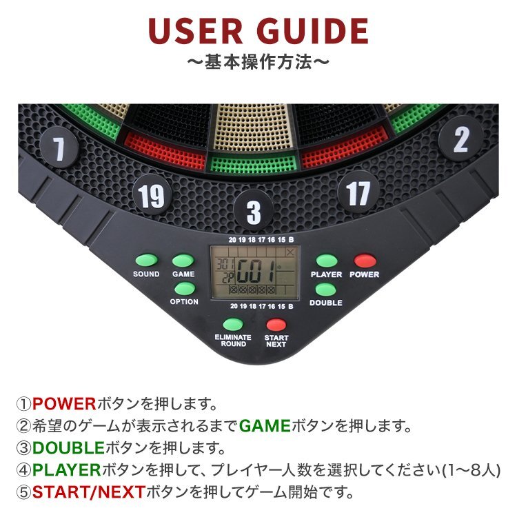 この1台で最大8人、25ゲームを楽しむ事ができます。 しかもダーツを始めるのに必要なパーツはすべて同梱され 自動計算までしてくれるので、自宅に届いたその日から遊ぶことができます!! ※単3電池が3つ必要です。ご了承ください。 ●商品仕様 サイズ: 本体)約410mm×498mm×27mm (ダーツ矢)約150mm 重量: 1.22kg ●商品内容 ・フライト×6 ・シャフト×6 ・バレル×6 ・チップ×30 ・取扱説明書(英語) ※ダーツ矢が6本分とチップ部分は破損が多いためスペアが入っております。 |