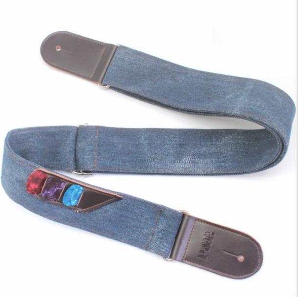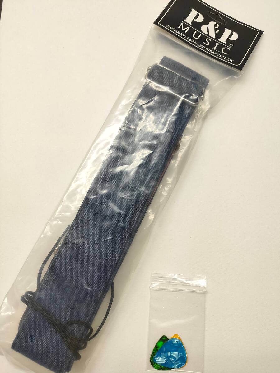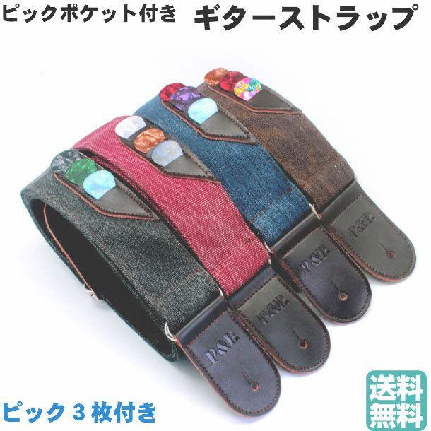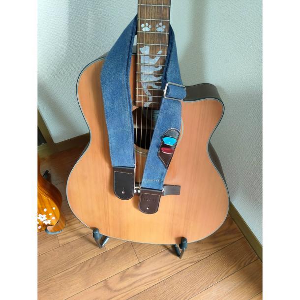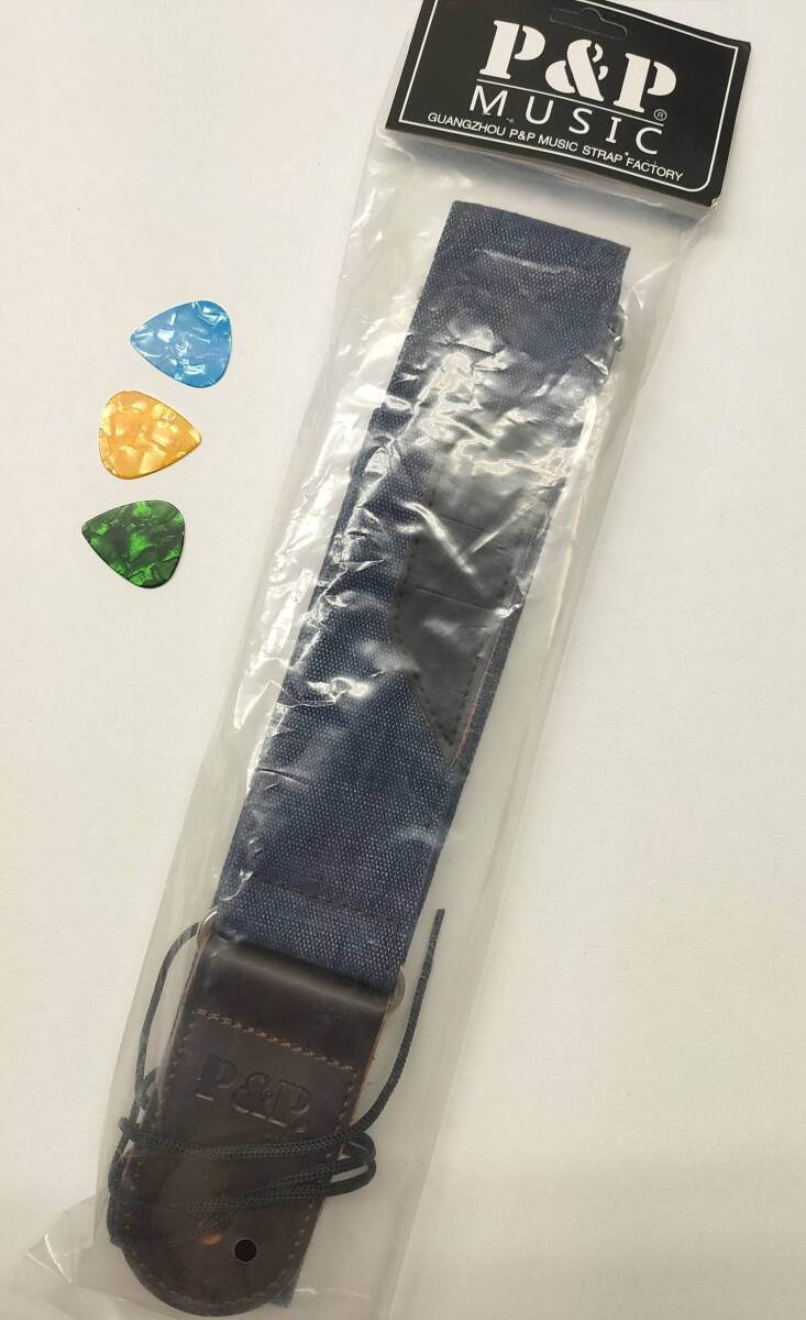 サイズ:幅 5cm 長さ87cm〜135cm デニム生地とレザーを使ったとってもいい感じのストラップです。 革にしか出せないしなやかさと強さ、デニムもまた丈夫でありながら、体にフィットする柔らかさ。 予備のピックを入れられるピックポケットは、ライブで安心できます。 演奏する者としてストラップに求める要件を全てクリアしています。 ギター、アコースティックギター、エレクトリックギター、ベースギターで使用できます。 硬さの違うピック3枚付(カラーはランダムになります。) ギターストラップ ピックポケット付き デニム ピック3枚付き ギターストラップ P&P