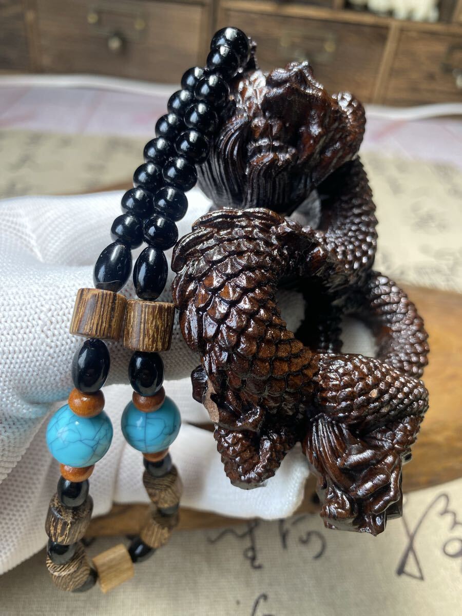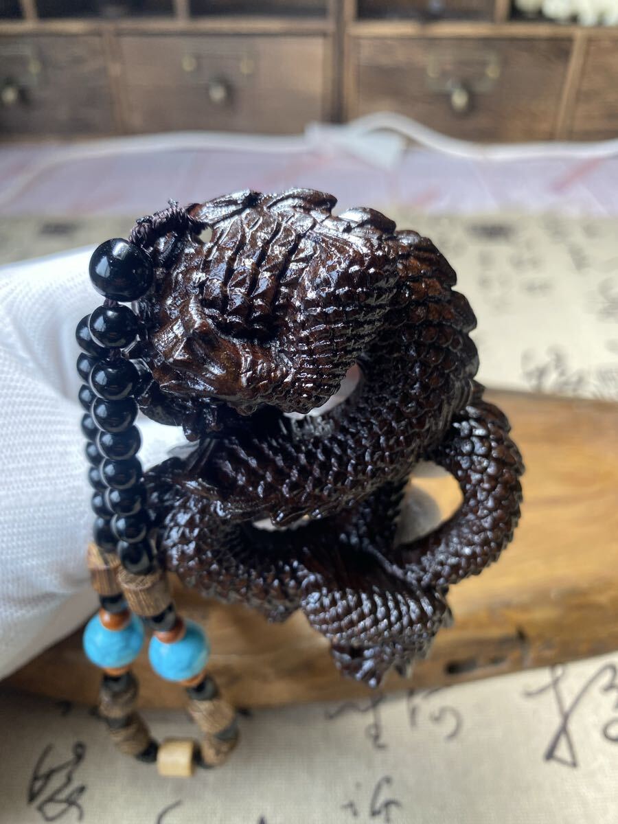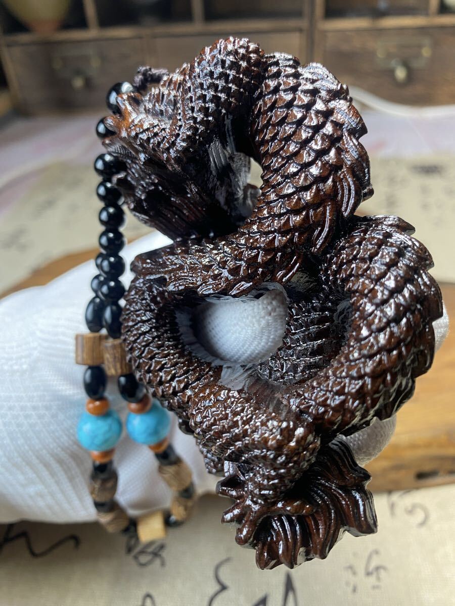 送料無料 仏教美術 龍 高級木材 細密木彫 一刀彫 リアル繊細彫刻(龍/竜/辰) 置物 飾り 工芸品 高さ約10ベトナム産沈香 美品 根付