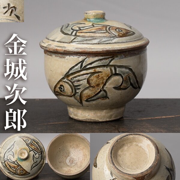 | 金城次郎の魚紋蓋物。箱無。真作保証。 サイズは、幅約10.5cm、高さ約10.5cm(蓋含む)。 蓋のつまみと縁、本体のくちに釉剥げがあります。 状態、詳細は画像でご確認ください。 |