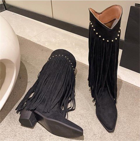 ロングブーツ ウエスタンフリンジ リベット Vポート ギャル レディースシューズ 【41】25.5cm ブラック