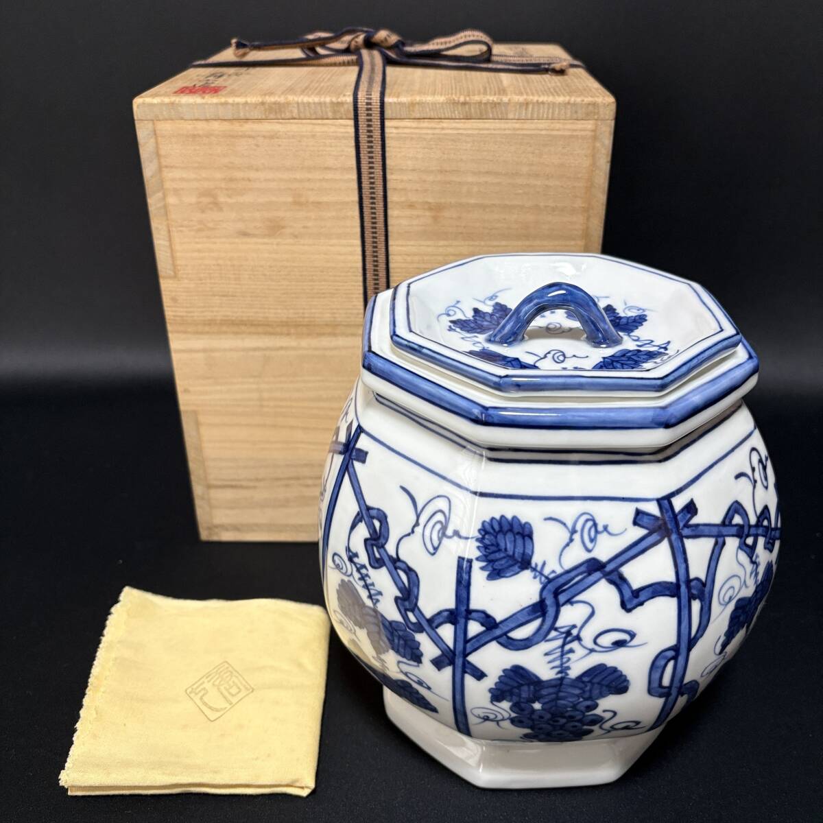 【祥】平安 富田静山 造 染付 八角 葡萄棚 水指 共箱 共布 在銘 茶道具 京焼 磁器 青花 古美術 骨董