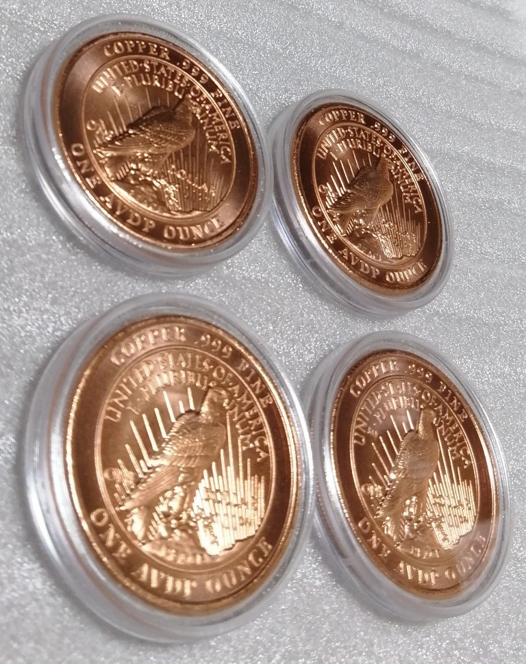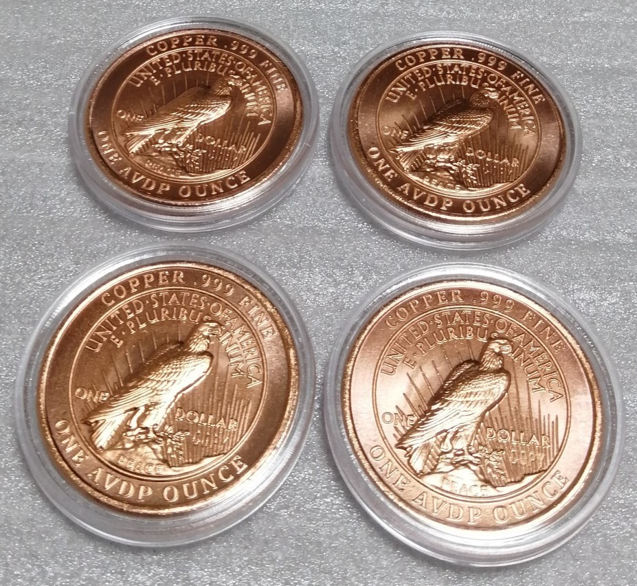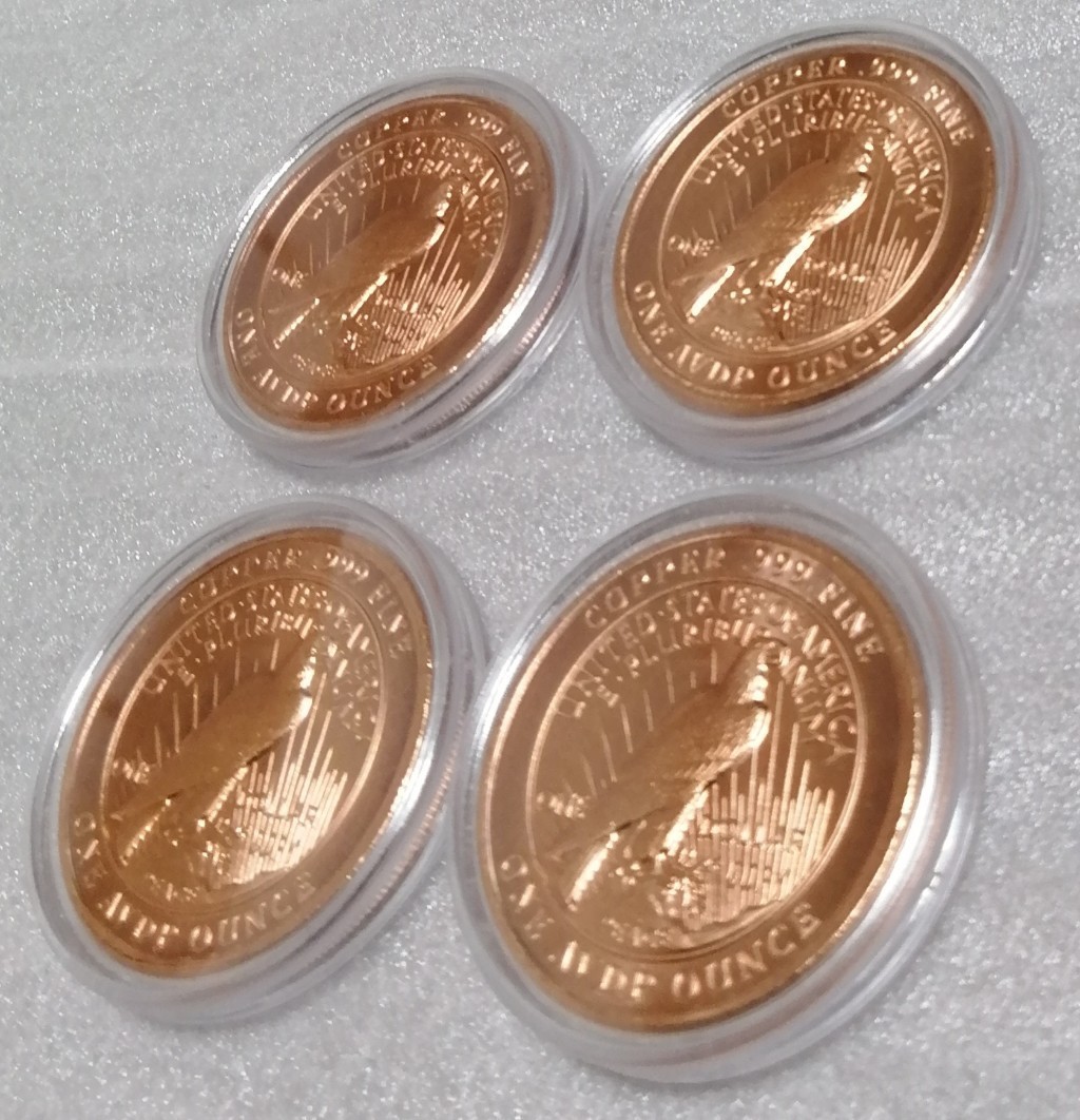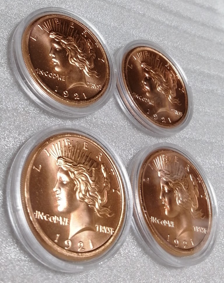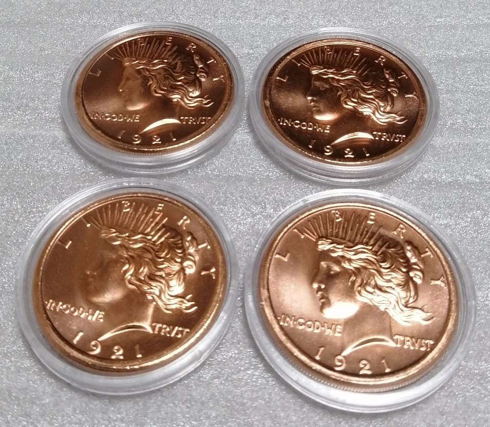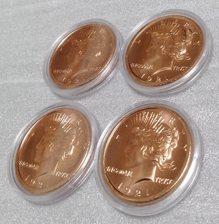 重量28.35グラム。直径39ミリ。純度.999。ピースダラー 銅ラウンド純銅。4枚セット。カプセル入り。