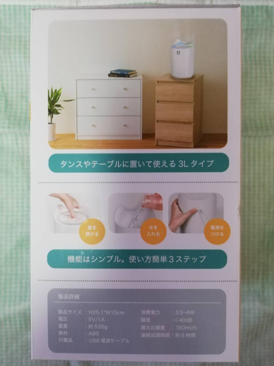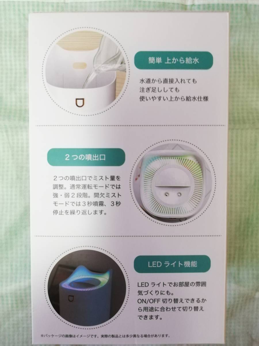 ★主な機能:簡単上から給水、2つの噴出口、LEDライト機能(ON/OFF切り替え可能)、USB電源コード付属、最大出霧量180ml、連続加湿時間約8時間、3Lタンク です。