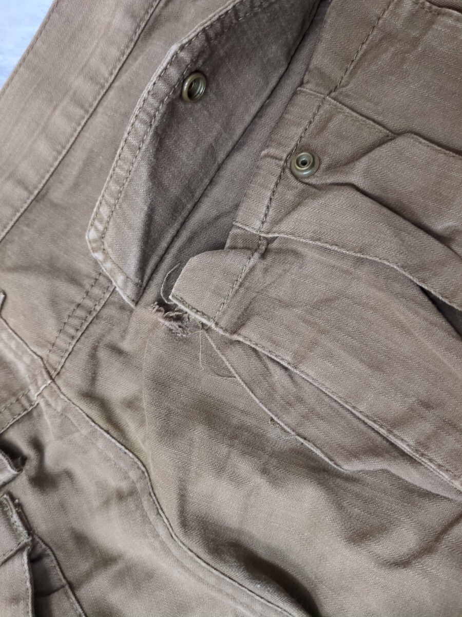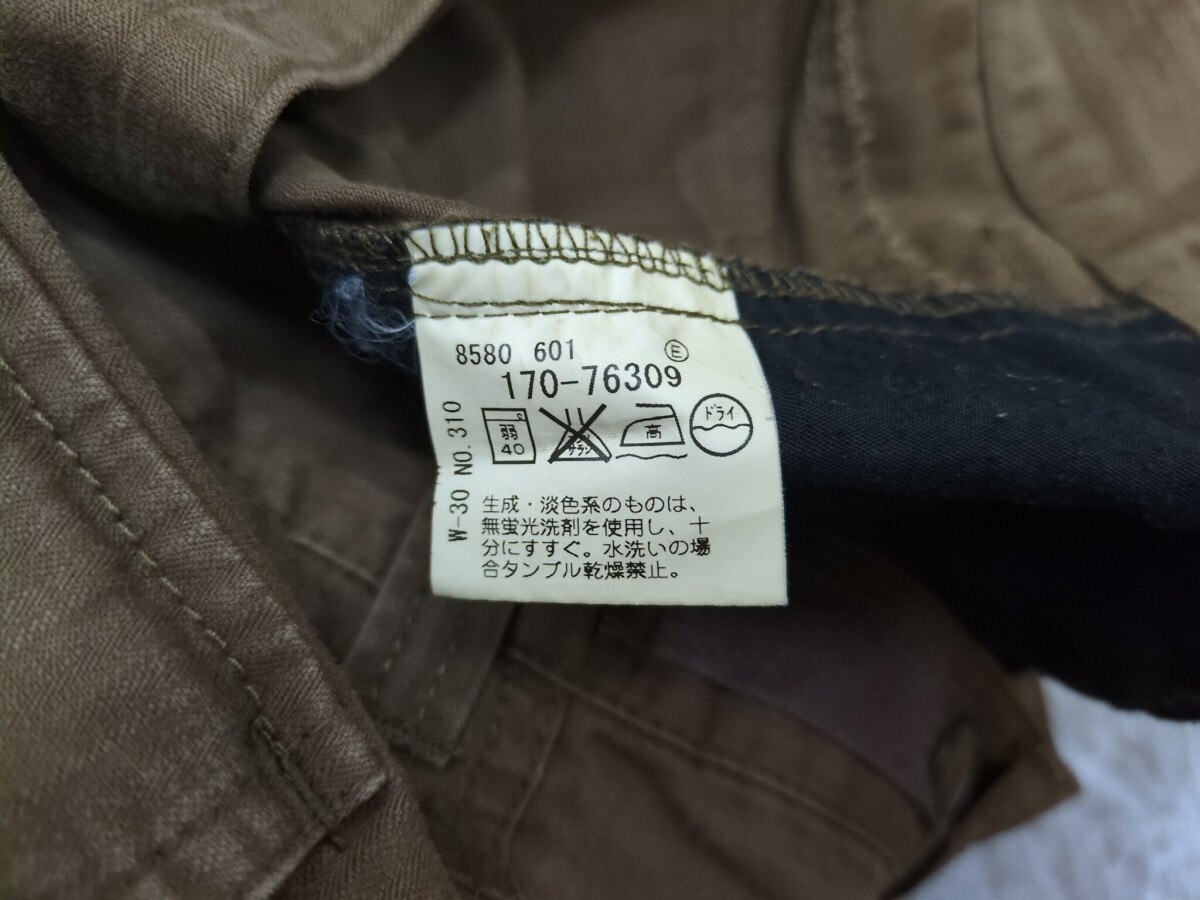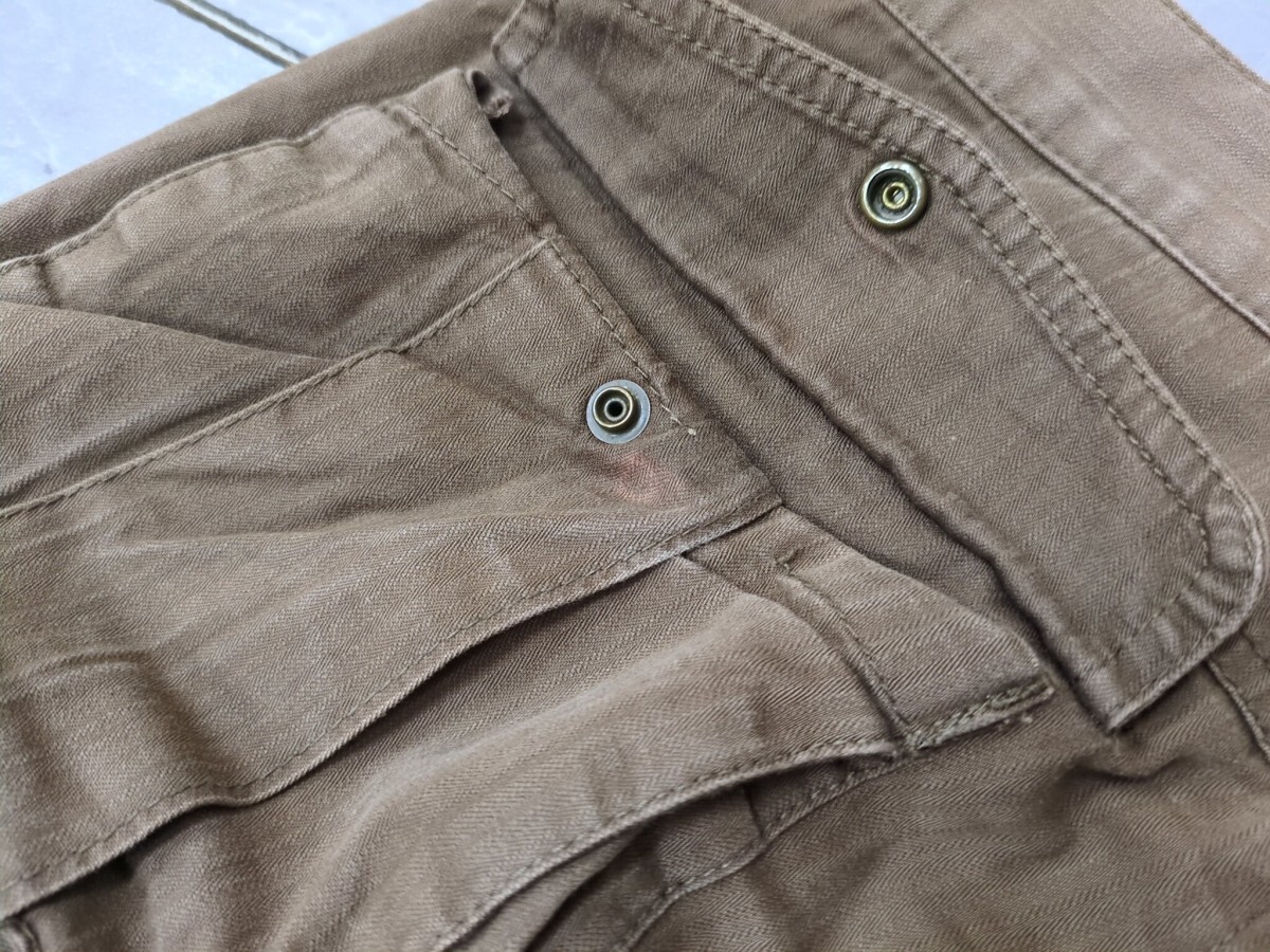 | バック上部に穴 バックポケットボタン留め付近に着色 裾に擦れキズ 汚れ 使用感があります |