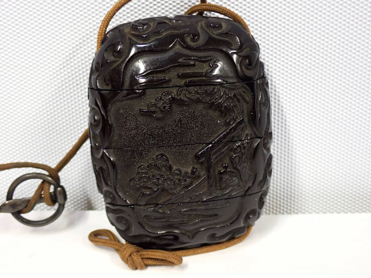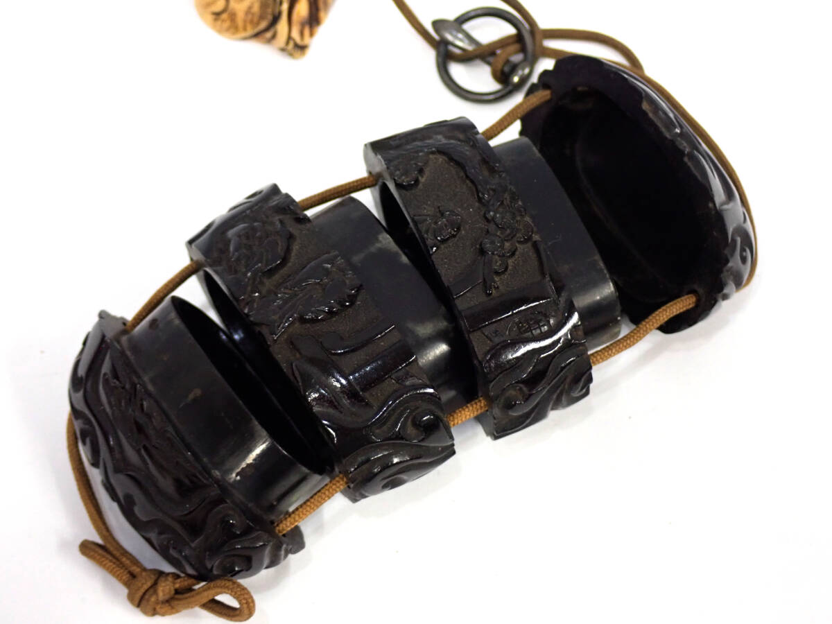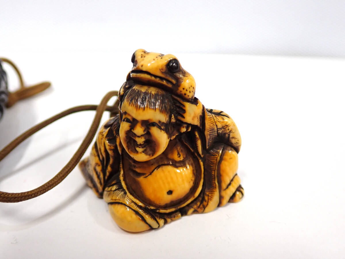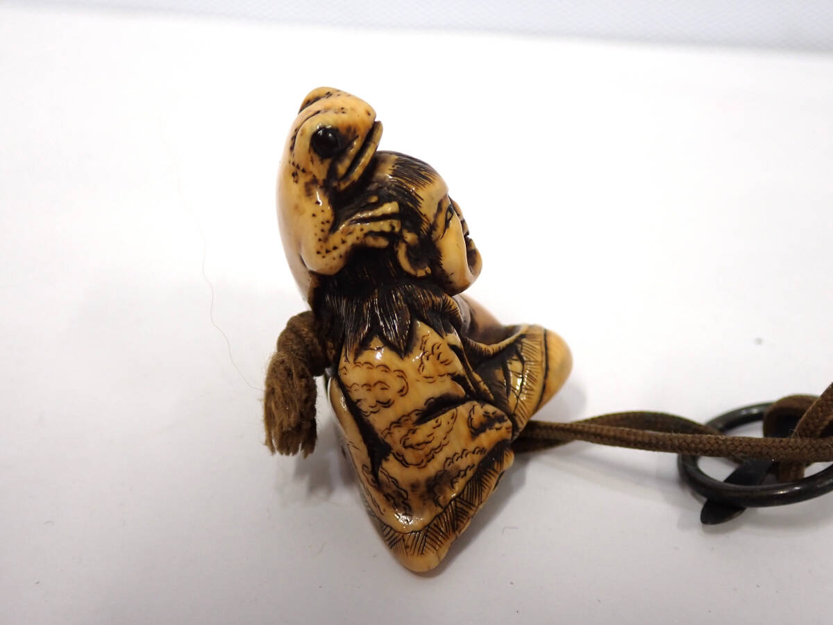 ・時代物 根付 彫刻 蛙を乗せた人物彫 提げ物 人物/風景彫 薬入れ/印籠 中国 骨董品 長期保管品
