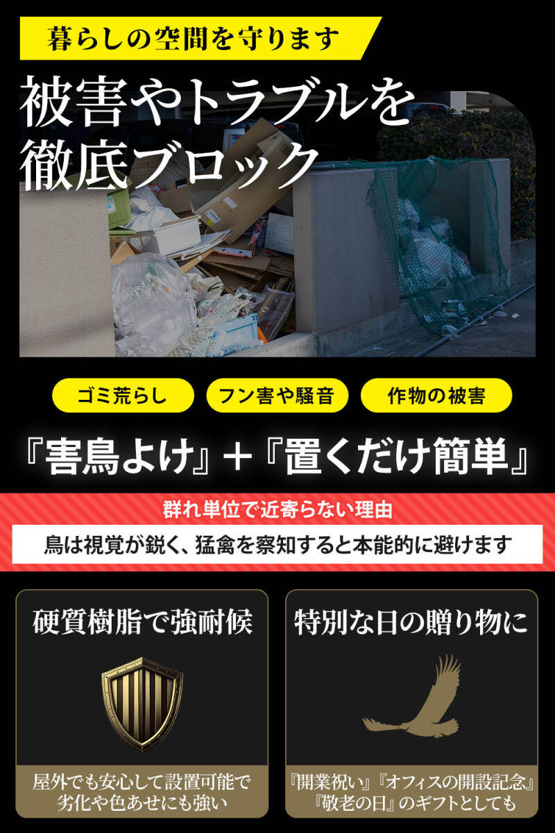 リアルな造形と力強い存在感を誇る鷹・鷲の置物は、畑や庭、ベランダや玄関、ヨットやボート、駐車場などに設置するだけで、鳩よけ(ハト)、カラスよけ、野鳥、スズメ、ムクドリ、コウモリ、海鵜など、幅広い害鳥を効果的に遠ざけます。一般的に鳥よけ(害鳥対策アイテム)はフクロウが有名ですが、タカやワシはそれ以上に効果があるという声も聞くほどです。また、鳥類は視覚が非常に優れており、遠くからでも天敵である猛禽類を察知すると本能的に近寄らなくなるため、精巧に再現されたこの置物があるだけで群れ単位での接近を阻止できます。結果としてフン害(糞)や騒音、栽培中の野菜や果樹への被害、さらにはゴミ荒らしなどのトラブルを回避できます。設置は簡単でただ置くだけなので電源も不要です。