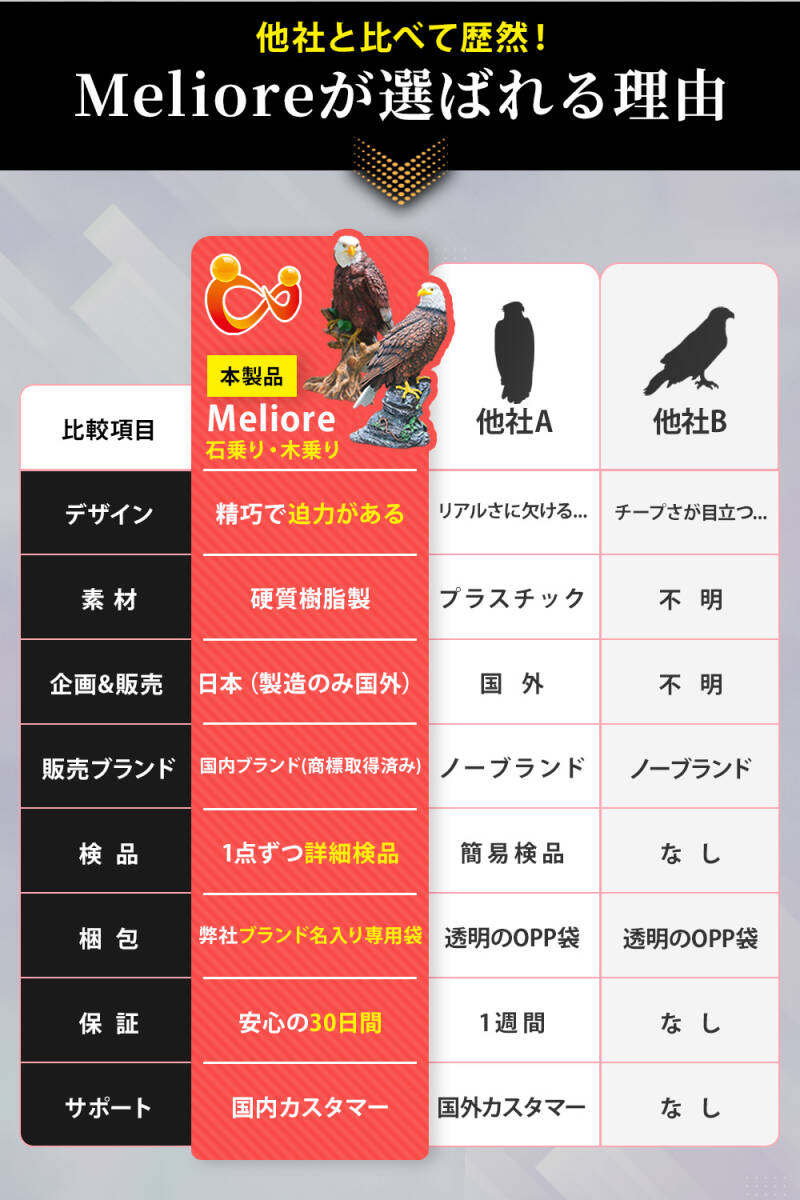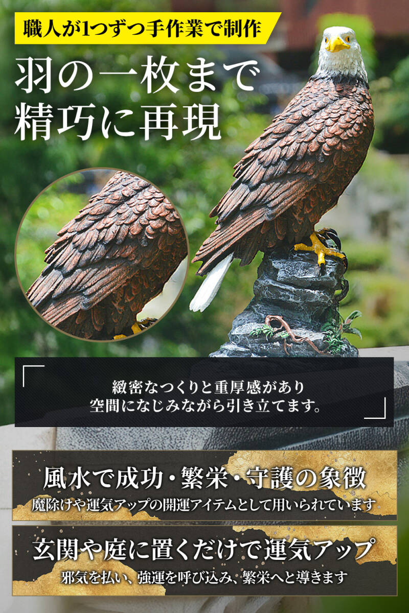 風水では鷹や鷲は「成功」「繁栄」「守護」の象徴とされ、開運グッズ・運気アップ・魔除けとして親しまれてきました。玄関や庭に置くだけで邪気を払い、空間を清めます。強運を呼び込むインテリアとしても最適で、仕事運や金運の象徴として飾られることも多く、ご自宅やオフィス、開業祝いや贈答用にも喜ばれるアイテムです。さらには、家やご家族を繁栄へと導く象徴とも言われております。