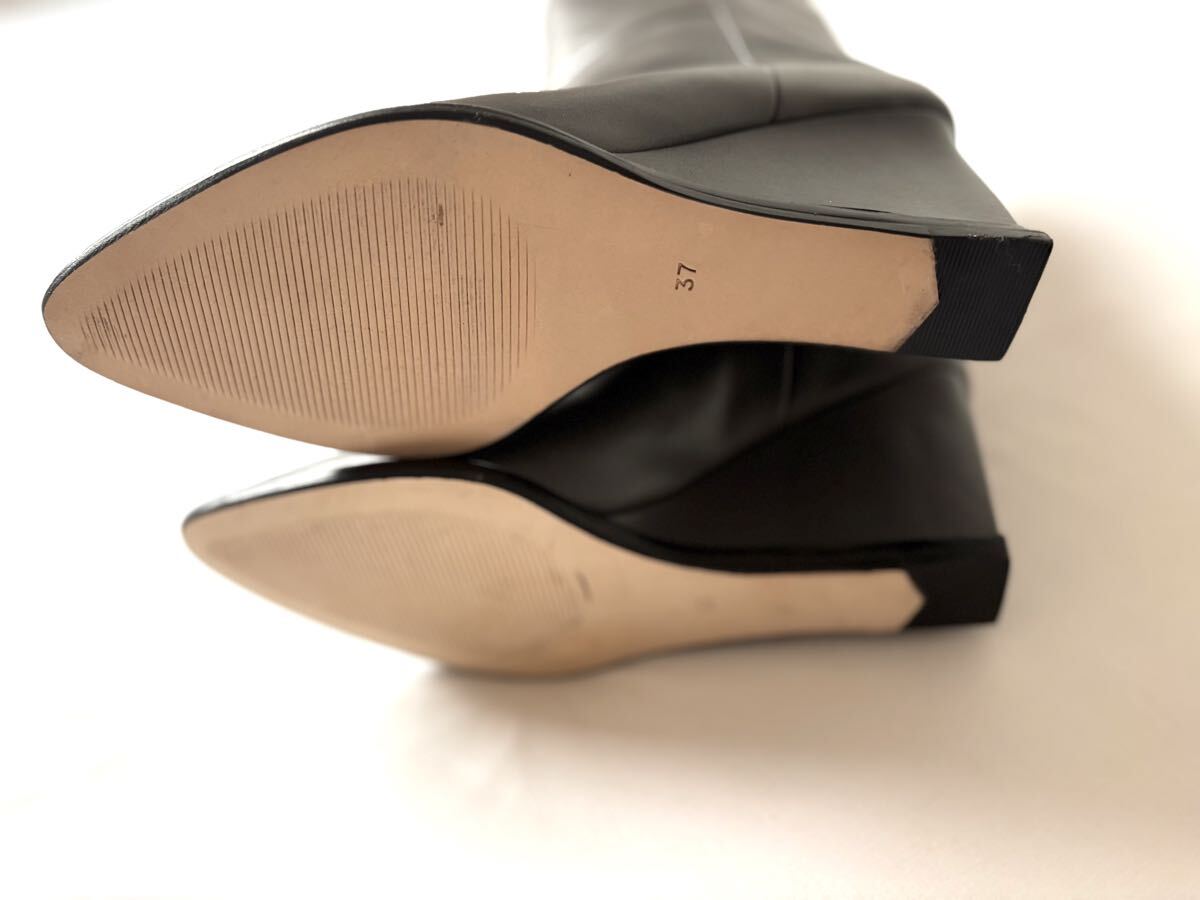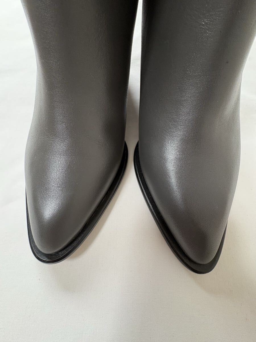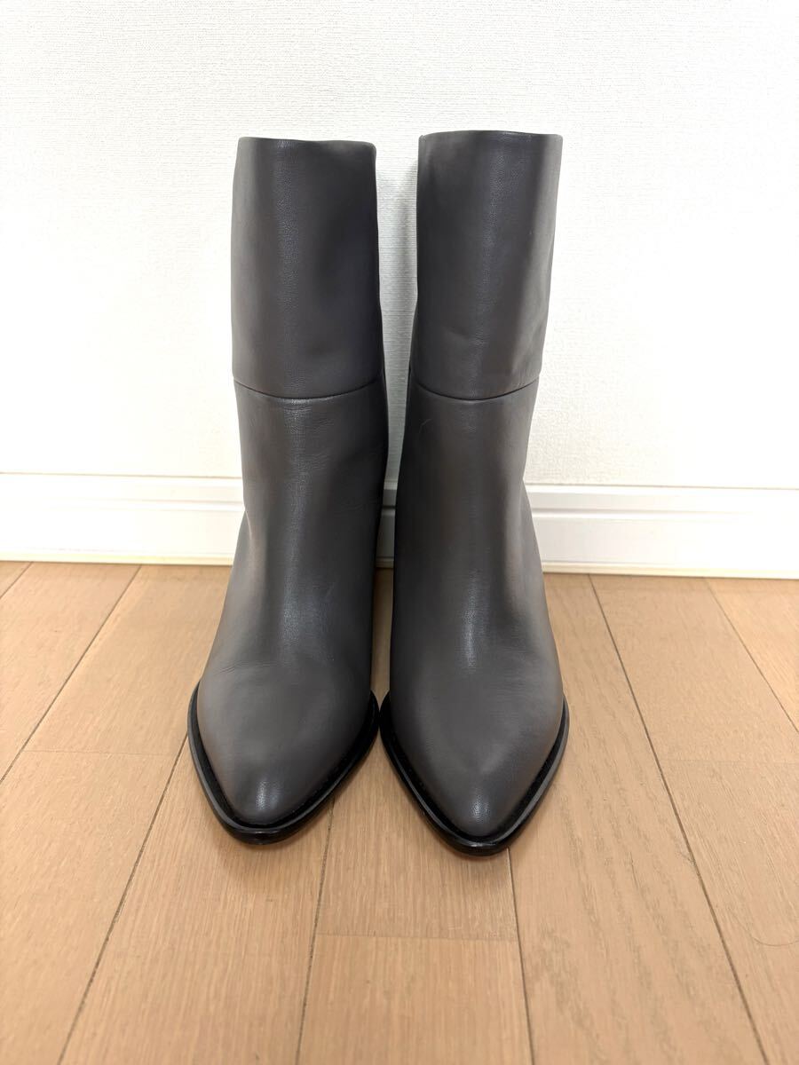「トゥモローランド」にて購入した「JVAM」のブーツです。サイズ・・・37(約23.5cm~24cm)。素材・・・レザー。カラー・・・グレー。定価・・・37400円。すっきりとしたシャープなポインテッドトゥト、ボリューム感のあるウエッジソールが特徴でモードな雰囲気です。かかとのスクエアデザインで、後ろのシルエットも素敵です。ウエッジの高さは約7.5cmです。2024年に購入し、未使用の自宅保管品です。そのままクローゼットに置いていたので、多少細かな擦れなどがあります。1度個人の手に渡ったものですので、神経質な方はご遠慮ください。箱やタグはありません。よろしくお願いいたします。