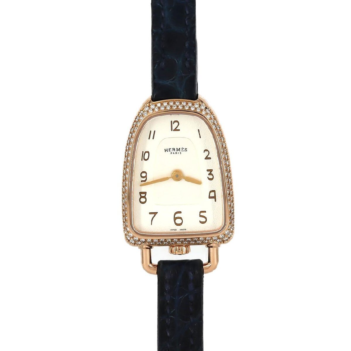 2018年に登場した「ギャロップ・ドゥ・エルメス」。エルメスのルーツである馬具の「鐙(あぶみ)」から着想を得た、左右非対称のケースデザインが特徴のコレクションです。当モデル(Ref. GA1.171)は、その中でも18Kピンクゴールドを採用したエレガントな一本。サイズは20x27mmで、ベゼルにはダイヤモンドがセッティングされています。シルバーの文字盤には、疾走感を表現したユニークなデザインのアラビア数字インデックスを配置。ムーブメントには実用的なクォーツを搭載しています。エルメスらしい遊び心と、ジュエリーのような気品を兼ね備えたタイムピースです。