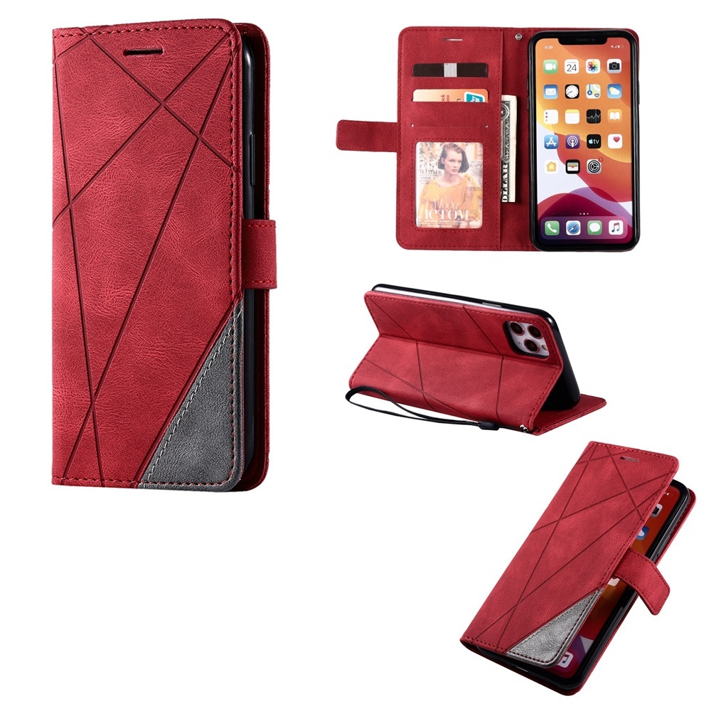 iPhone 13/iPhone 14 共用 ワインレッド 手帳型 レザー ケース カード,写真入&内ポケット ストラップ付 (格子柄)