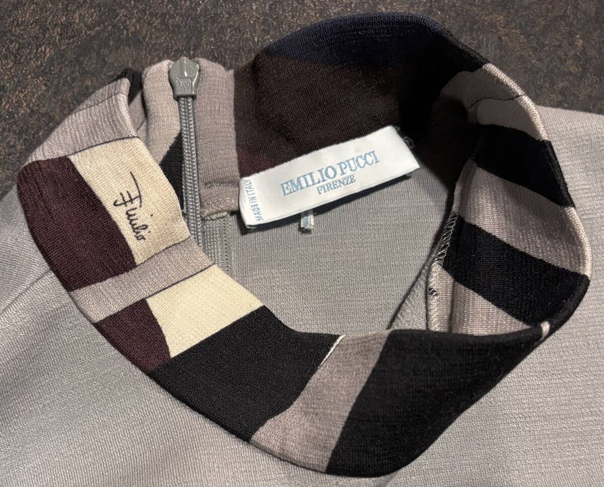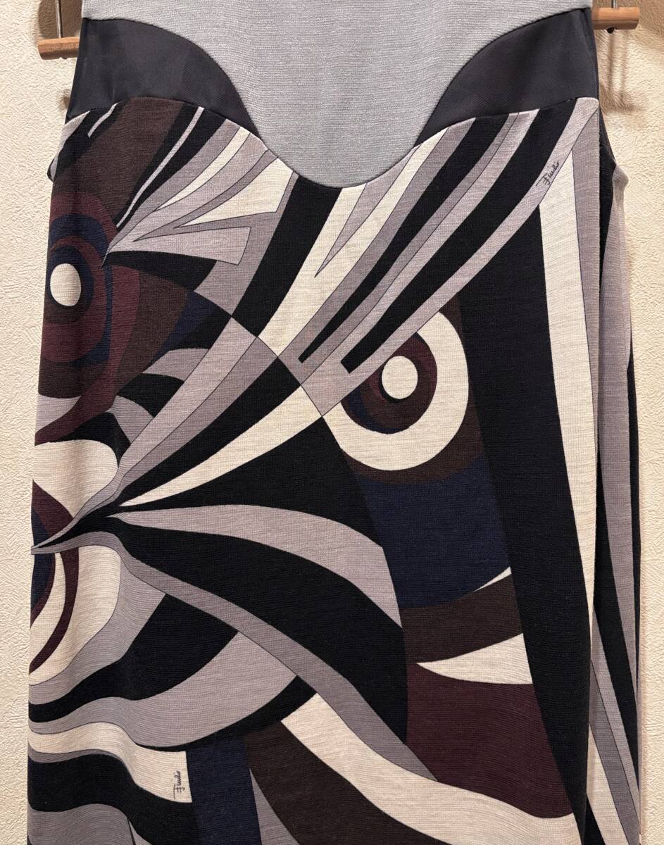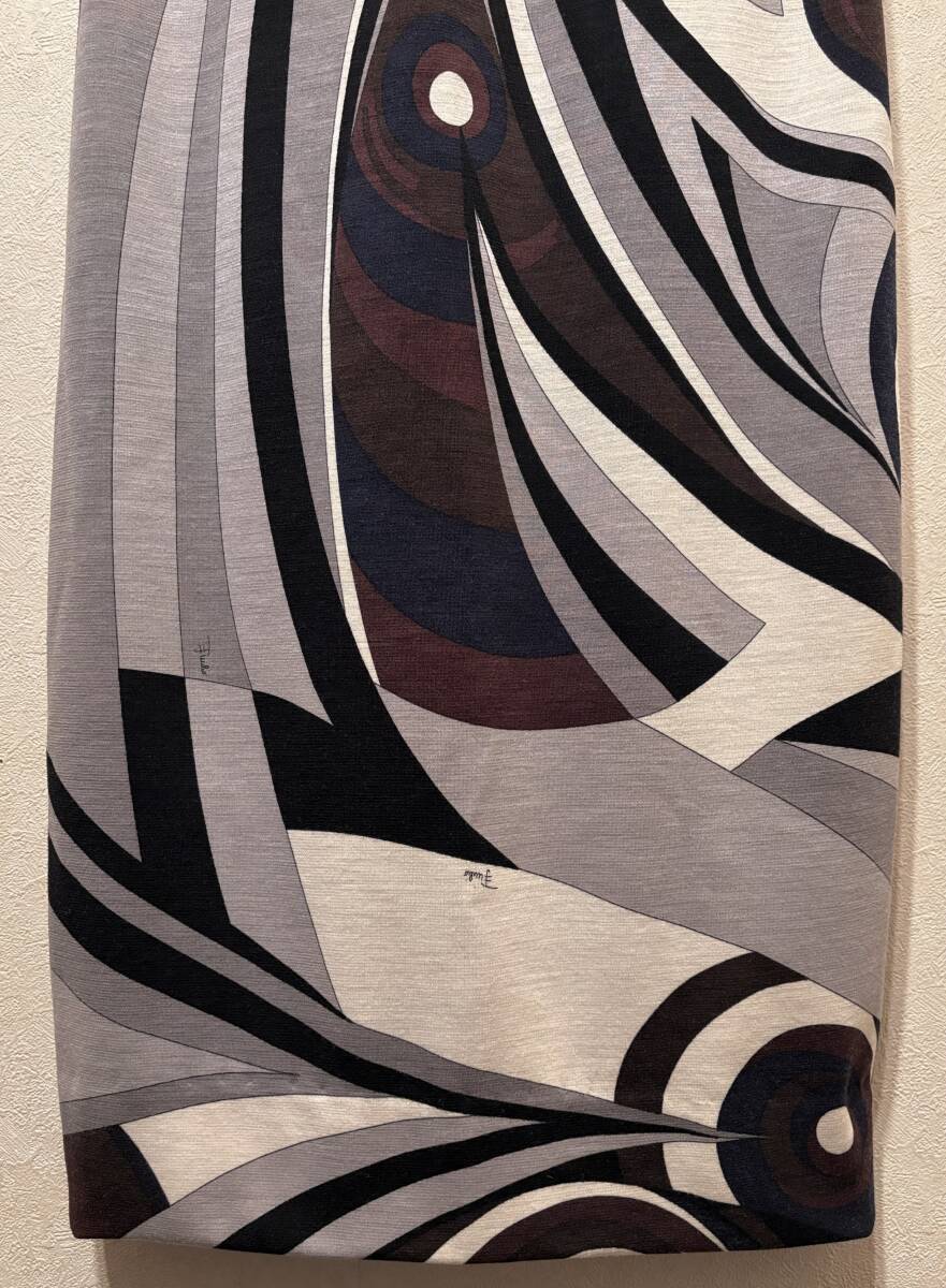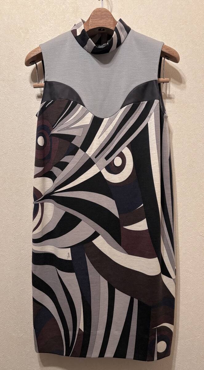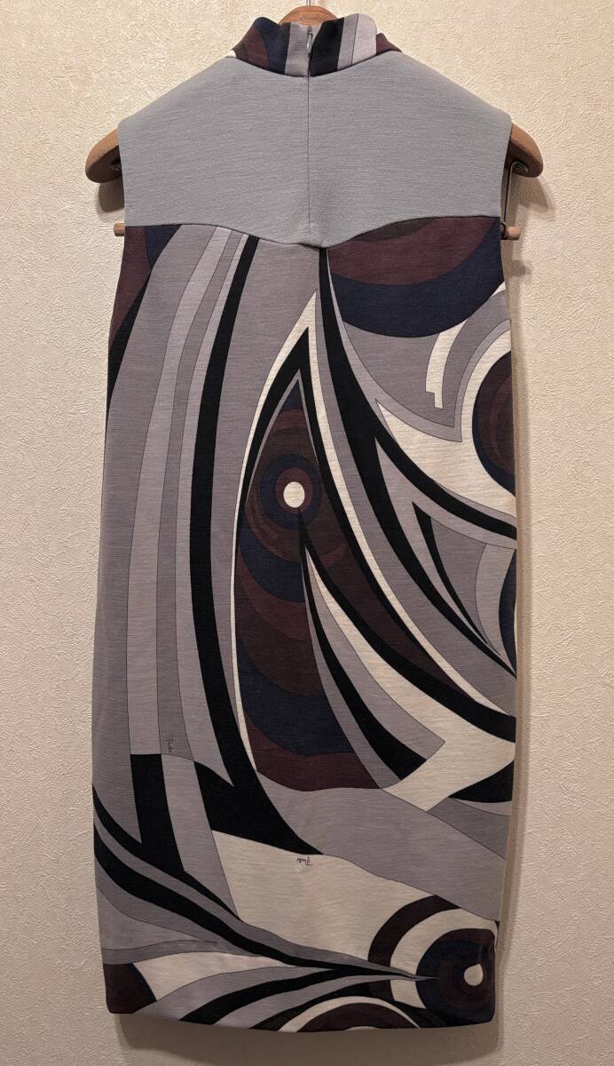 ITALY製オールドEMILIO PUCCIワンピース38黒グレー白バーガンディ紺ネイビー茶ノースリーブ名作エミリオ プッチ柄チュニック総柄ビンテージ