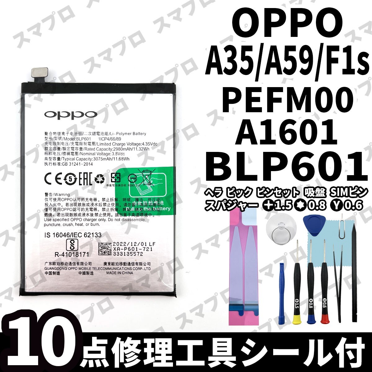 OPPO A35, A59, F1s PEFM00 A1601 バッテリー BLP601 専用 ・バッテリー本体 ・両面テープ ・修理交換用工具キット ※商品画像はイメージとなります。 |